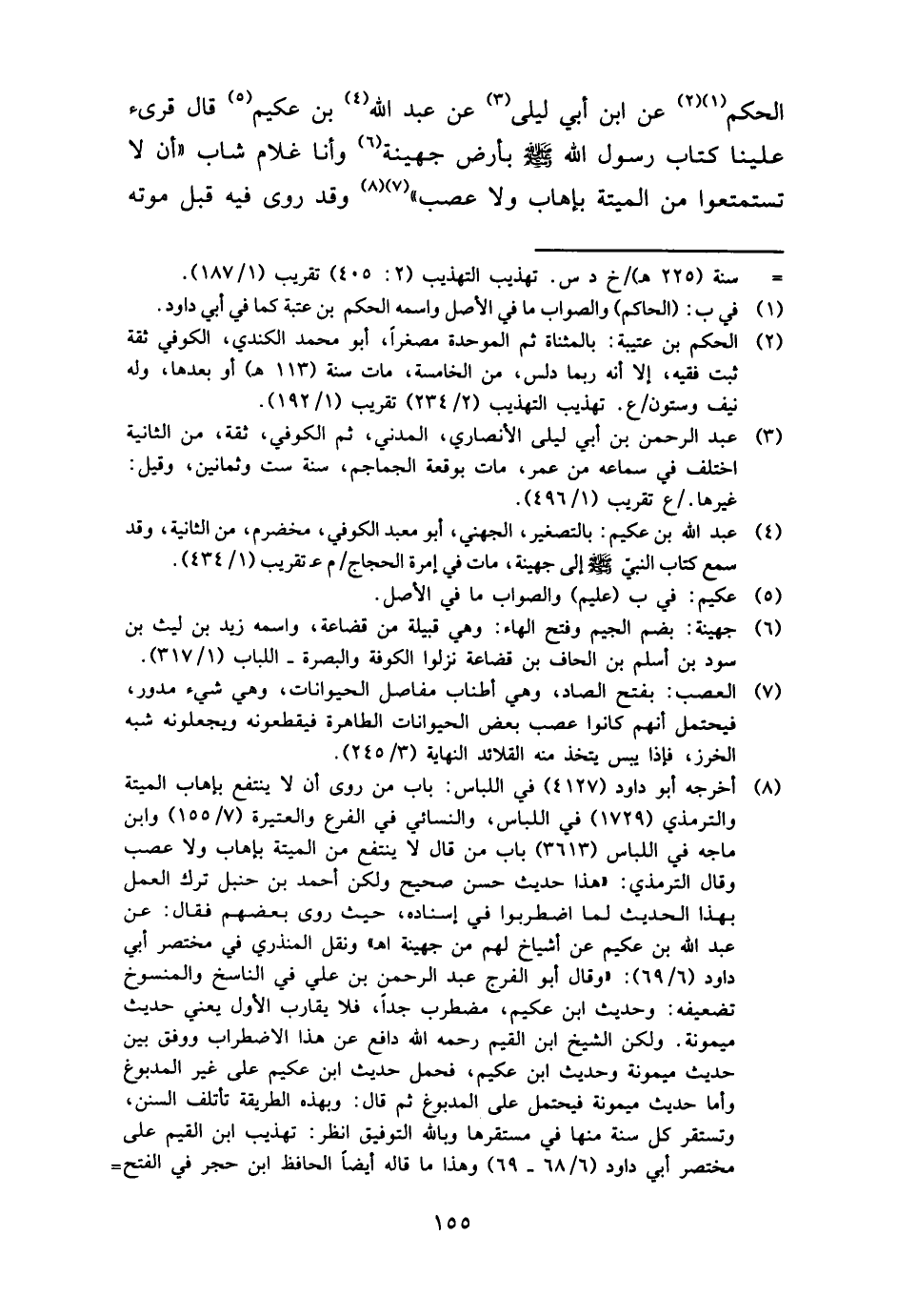 الحكم عَن ابْن أبي ليلى عَن عبد الله بن عكيم قَالَ قرئَ علينا كتاب رَسُول الله - صَلَّى اللَّهُ عَلَيْهِ وَسَلَّم َ - بِأَرْض جُهَيْنَة وَأَنا غُلَام شَاب " أَن لَا تستمتعوا من الْميتَة بإهاب وَلَا عصب " وَقد روى فِيهِ قبل مَوته