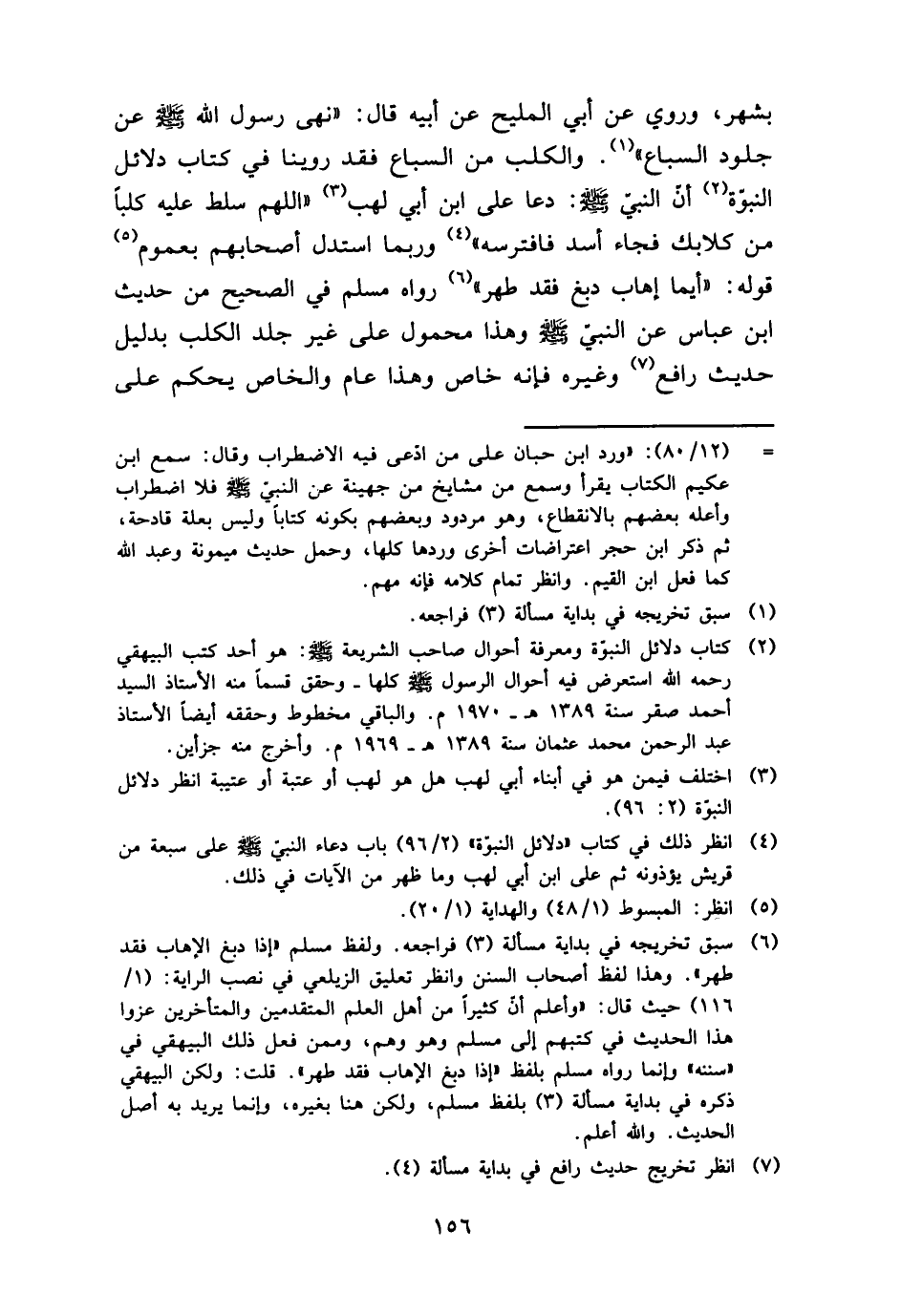 بِشَهْر، وَرُوِيَ عَن أبي الْمليح عَن أَبِيه قَالَ: " نهى رَسُول الله - صَلَّى اللَّهُ عَلَيْهِ وَسَلَّم َ - عَن جُلُود السبَاع ". وَالْكَلب من السبَاع فقد روينَا فِي كتاب دَلَائِل النُّبُوَّة أَن النَّبِي - صَلَّى اللَّهُ عَلَيْهِ وَسَلَّم َ -: دَعَا على ابْن أبي لَهب " اللَّهُمَّ سلط عَلَيْهِ كَلْبا من كلابك فجَاء أَسد فافترسه " وَرُبمَا اسْتدلَّ أَصْحَابهم بِعُمُوم قَوْله: " أَيّمَا إهَاب دبغا فقد طهر " رَوَاهُ مُسلم فِي الصَّحِيح من حَدِيث ابْن عَبَّاس عَن النَّبِي - صَلَّى اللَّهُ عَلَيْهِ وَسَلَّم َ - وَهَذَا مَحْمُول على غير جلد الْكَلْب بِدَلِيل حَدِيث رَافع وَغَيره فَإِنَّهُ خَاص وَهَذَا عَام وَالْخَاص يحكم على