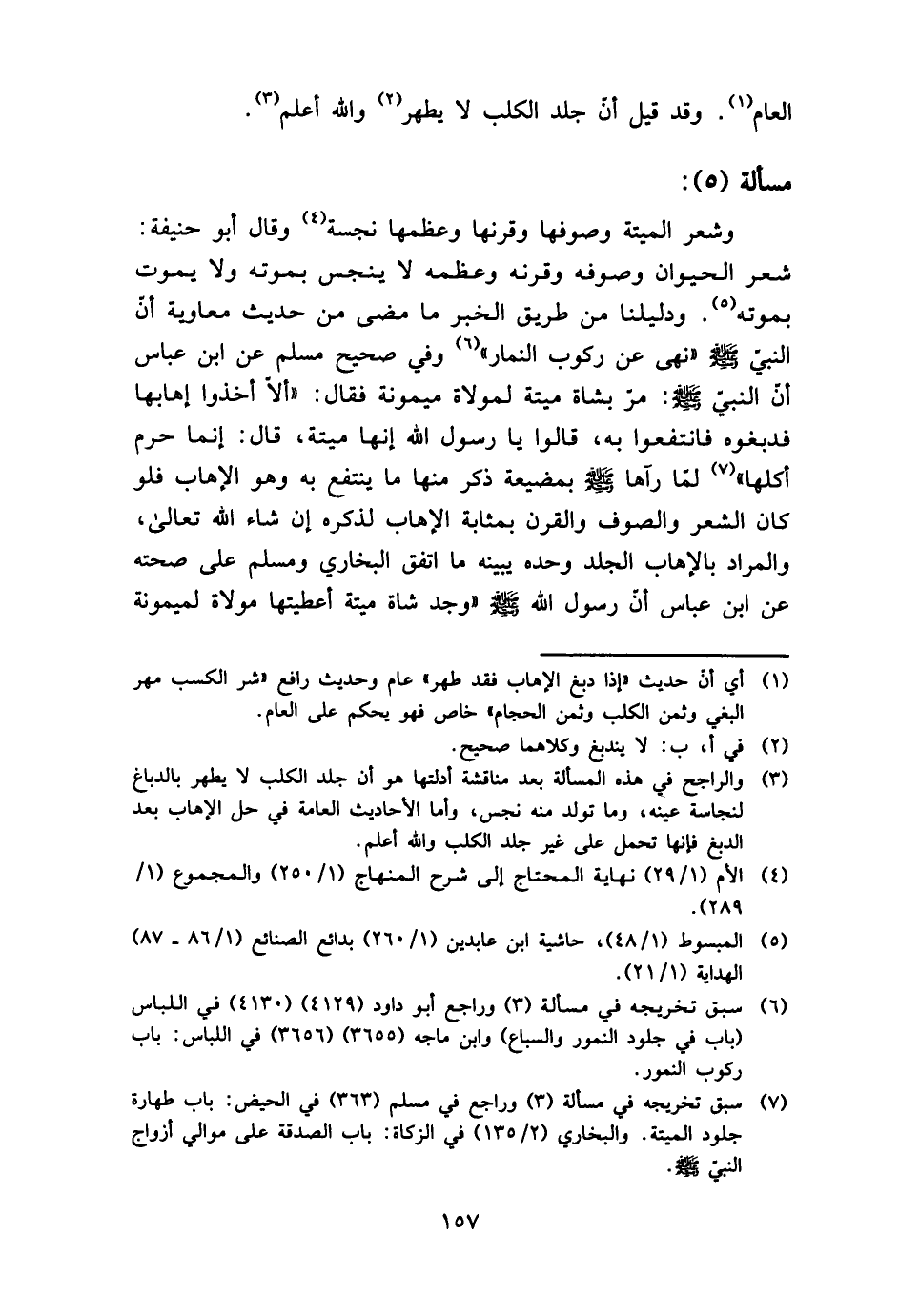 وَشعر الْميتَة وصوفها وقرنها وعظمها نَجِسَة وَقَالَ أَبُو حنيفَة: شعر الْحَيَوَان وصوفه وقرنه وعظمه لَا ينجس بِمَوْتِهِ وَلَا يَمُوت بِمَوْتِهِ. وَدَلِيلنَا من طَرِيق الْخَبَر مَا مضى من حَدِيث مُعَاوِيَة أَن النَّبِي - صَلَّى اللَّهُ عَلَيْهِ وَسَلَّم َ - " نهى عَن ركُوب النمار " وَفِي صَحِيح مُسلم عَن ابْن عَبَّاس أَن النَّبِي - صَلَّى اللَّهُ عَلَيْهِ وَسَلَّم َ -: " مر بِشَاة ميتَة لمولاة مَيْمُونَة فَقَالَ: " أَلا أخذُوا إهابها فدبغوه فانتفعوا بِهِ، قَالُوا يَا رَسُول الله إِنَّهَا ميتَة، قَالَ: إِنَّمَا حرم أكلهَا " لما رَآهَا - صَلَّى اللَّهُ عَلَيْهِ وَسَلَّم َ - بمضيعة ذكر مِنْهَا مَا ينْتَفع بِهِ وَهُوَ الإهاب فَلَو كَانَ الشّعْر وَالصُّوف والقرن بِمَثَابَة الإهاب لذكره إِن شَاءَ الله تَعَالَى، وَالْمرَاد بالإهاب الْجلد وَحده يُبينهُ مَا اتّفق البُخَارِيّ وَمُسلم على صِحَّته عَن ابْن عَبَّاس أَن رَسُول الله - صَلَّى اللَّهُ عَلَيْهِ وَسَلَّم َ - " وجد شَاة ميتَة أعطيتهَا مولاة لميمونة