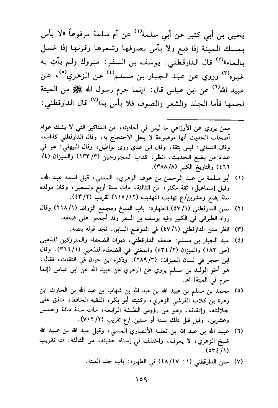يحيى بن أبي كثير عَن أبي سَلمَة عَن أم سَلمَة مَرْفُوعا " لَا بَأْس بمسك الْميتَة إِذا دبغ وَلَا بَأْس بصوفها وشعرها وقرنها إِذا غسل بِالْمَاءِ " قَالَ الدَّارَقُطْنِيّ: يُوسُف بن السّفر: مَتْرُوك وَلم يَأْتِ بِهِ غَيره وَرُوِيَ عَن عبد الْجَبَّار بن مُسلم عَن الزُّهْرِيّ، عَن عبيد الله عَن ابْن عَبَّاس قَالَ: " إِنَّمَا حرم رَسُول الله - صَلَّى اللَّهُ عَلَيْهِ وَسَلَّم َ - من الْميتَة لَحمهَا فَأَما الْجلد وَالشعر وَالصُّوف فَلَا بَأْس بِهِ " قَالَ الدَّارَقُطْنِيّ: