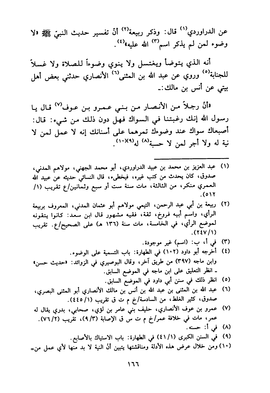 عَن الدَّرَاورْدِي قَالَ: وَذكر ربيعَة أَن تَفْسِير حَدِيث النَّبِي - صَلَّى اللَّهُ عَلَيْهِ وَسَلَّم َ - " لَا وضوء لمن لم يذكر اسْم الله عَلَيْهِ ".