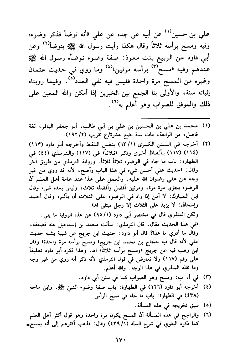 عَليّ بن حُسَيْن عَن أَبِيه عَن جده عَن عَليّ " أَنه تَوَضَّأ فَذكر وضوءه وَفِيه وَمسح بِرَأْسِهِ ثَلَاثًا وَقَالَ هَكَذَا رَأَيْت رَسُول الله - صَلَّى اللَّهُ عَلَيْهِ وَسَلَّم َ - يتَوَضَّأ وَعَن أبي دَاوُد عَن الرّبيع بنت معوذ: صفة وضوء توضأه رَسُول الله - صَلَّى اللَّهُ عَلَيْهِ وَسَلَّم َ - عِنْدهم وَفِيه " مسح بِرَأْسِهِ مرَّتَيْنِ " وَمَا رُوِيَ فِي حَدِيث عُثْمَان وَغَيره من الْمسْح مرّة وَاحِدَة فَلَيْسَ فِيهِ نفي الْعدَد، وَفِيمَا روينَاهُ إثْبَاته سنة، وَالْأولَى بِنَا الْجمع بَين الْخَبَرَيْنِ إِذا أمكن وَالله الْمعِين على ذَلِك والموفق للصَّوَاب وَهُوَ أعلم بِهِ.
