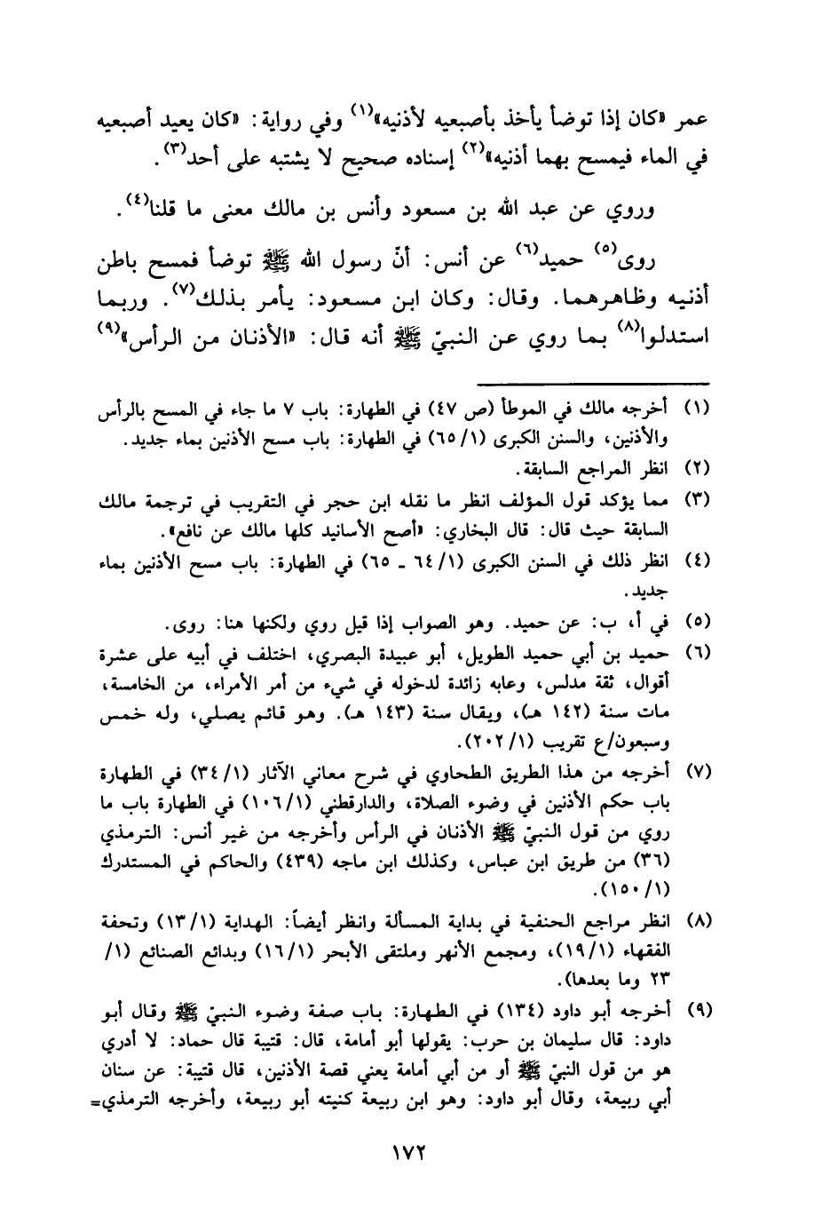 عمر " كَانَ إِذا تَوَضَّأ يَأْخُذ بِأُصْبُعَيْهِ لأذنيه " وَفِي رِوَايَة: " كَانَ يُعِيد أصبعيه فِي المَاء فيمسح بهما أُذُنَيْهِ " إِسْنَاده صَحِيح لَا يشْتَبه على أحد.