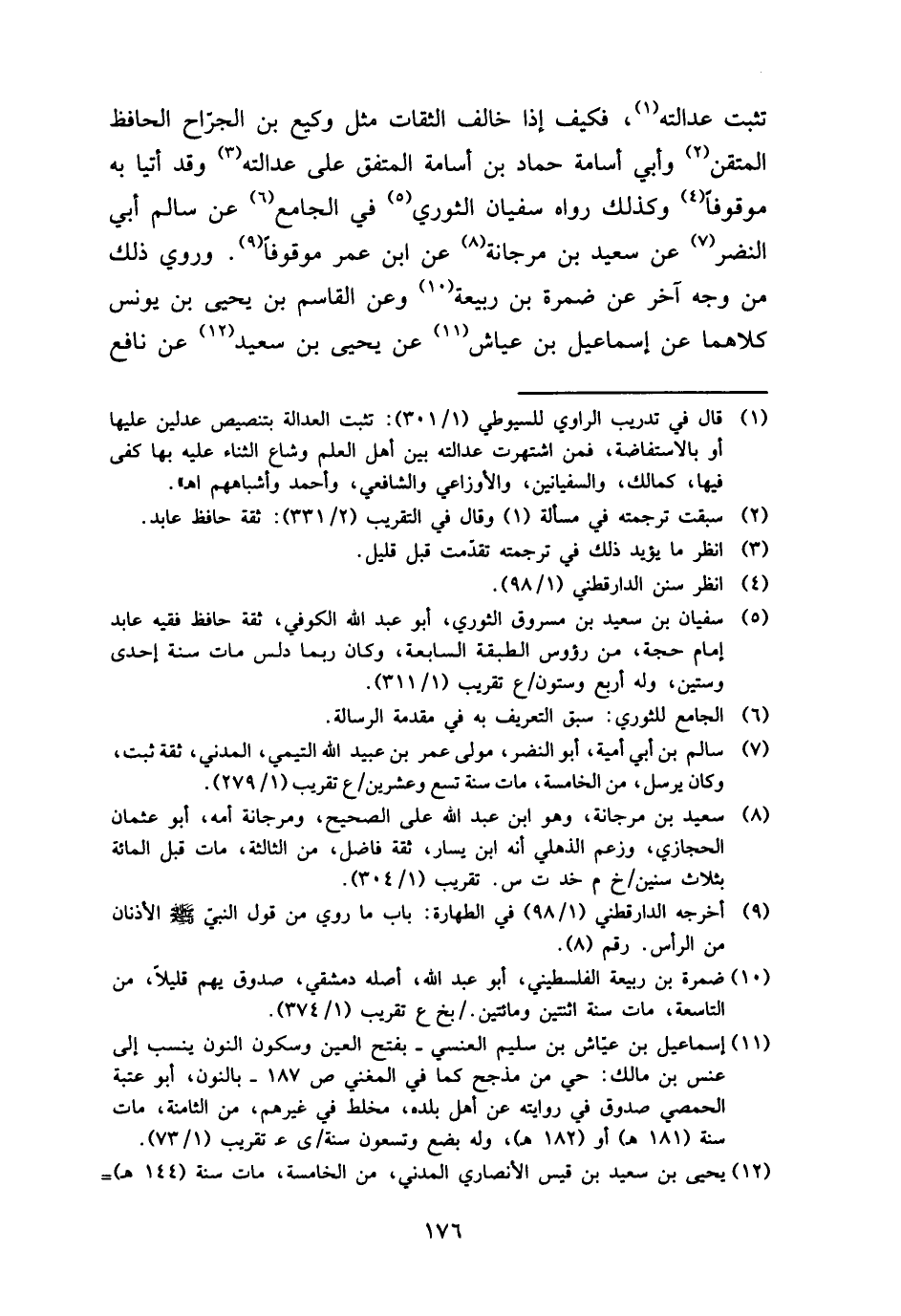 تثبت عَدَالَته، فَكيف إِذا خَالف الثِّقَات مثل وَكِيع بن الْجراح الْحَافِظ المتقن وَأبي أُسَامَة حَمَّاد بن أُسَامَة الْمُتَّفق على عَدَالَته وَقد أَتَيَا بِهِ مَوْقُوفا وَكَذَلِكَ رَوَاهُ سُفْيَان الثَّوْريّ فِي الْجَامِع عَن سَالم أبي النَّضر عَن سعيد بن مرْجَانَة عَن ابْن عمر مَوْقُوفا. وَرُوِيَ ذَلِك من وَجه آخر عَن ضَمرَة بن ربيعَة وَعَن الْقَاسِم بن يحيى بن يُونُس كِلَاهُمَا عَن إِسْمَاعِيل بن عَيَّاش عَن يحيى بن سعيد عَن نَافِع