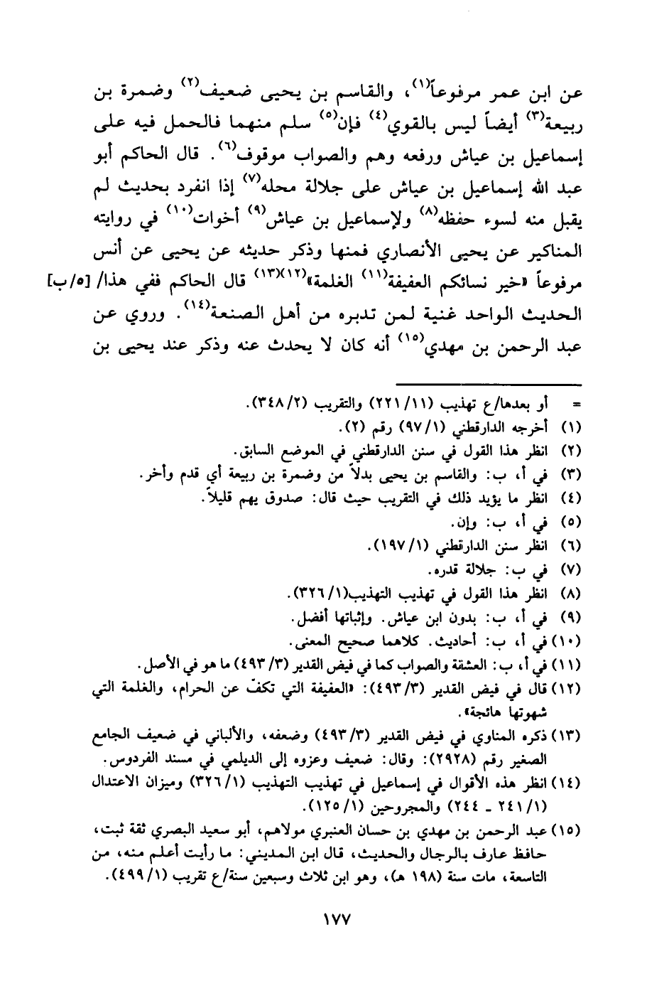 عَن ابْن عمر مَرْفُوعا، وَالقَاسِم بن يحيى ضَعِيف وضمرة بن ربيعَة أَيْضا لَيْسَ بِالْقَوِيّ فَإِن سلم مِنْهُمَا فالحمل فِيهِ على إِسْمَاعِيل بن عَيَّاش وَرَفعه وهم وَالصَّوَاب مَوْقُوف. قَالَ الْحَاكِم أَبُو عبد الله إِسْمَاعِيل بن عَيَّاش على جلالة مَحَله إِذا انْفَرد بِحَدِيث لم يقبل مِنْهُ لسوء حفظه ولإسماعيل بن عَيَّاش أَخَوَات فِي رِوَايَته الْمَنَاكِير عَن يحيى الْأنْصَارِيّ فَمِنْهَا وَذكر حَدِيثه عَن يحيى عَن أنس مَرْفُوعا " خير نِسَائِكُم العفيفة الغلمة " قَالَ الْحَاكِم فَفِي هَذَا الحَدِيث الْوَاحِد غنية لمن تدبره من أهل الصَّنْعَة. وَرُوِيَ عَن عبد الرَّحْمَن بن مهْدي أَنه كَانَ لَا يحدث عَنهُ وَذكر عِنْد يحيى بن