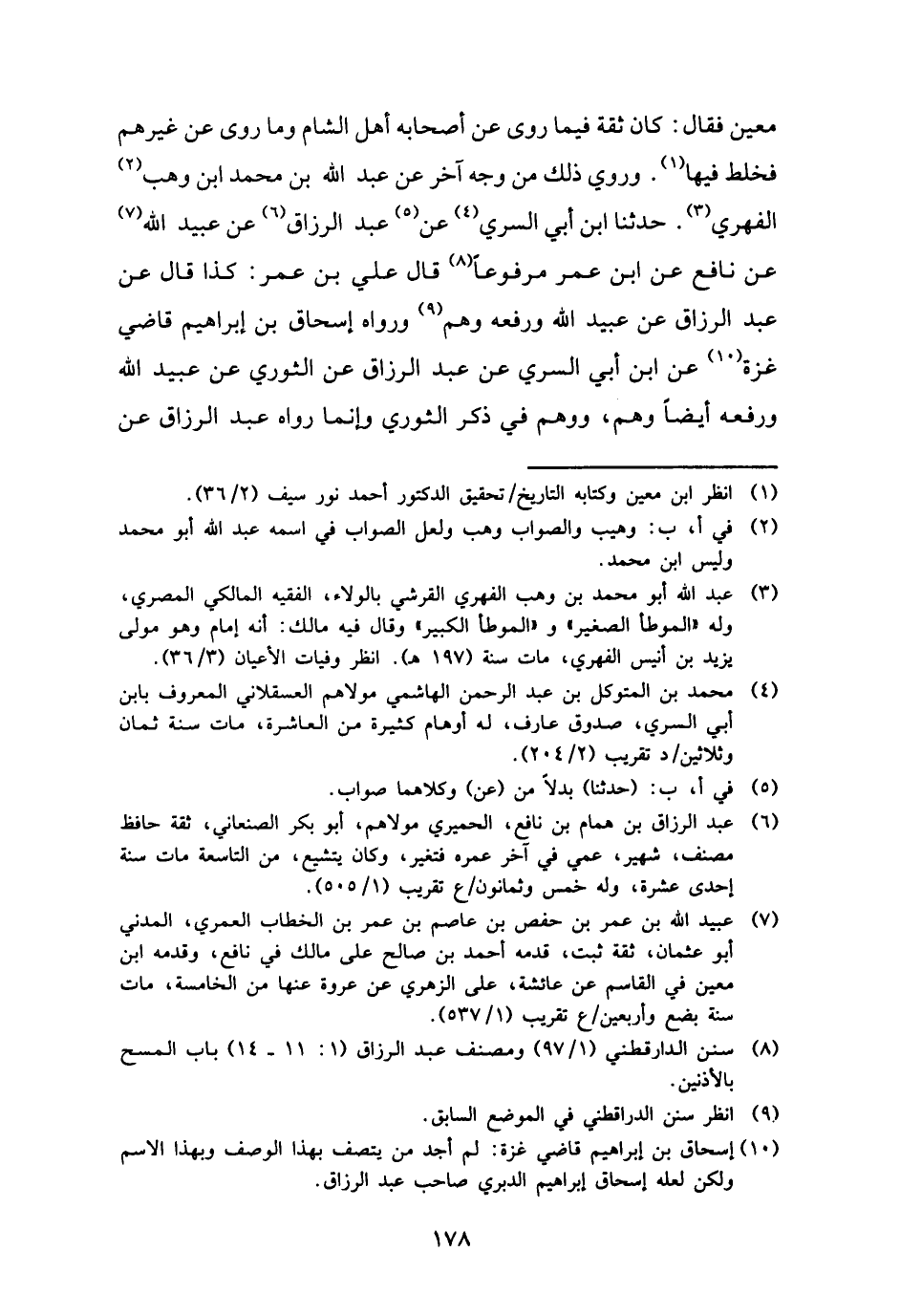 معِين فَقَالَ: كَانَ ثِقَة فِيمَا روى عَن أَصْحَابه أهل الشَّام وَمَا روى عَن غَيرهم فخلط فِيهَا. وَرُوِيَ ذَلِك من وَجه آخر عَن عبد الله بن مُحَمَّد ابْن وهب الفِهري. حَدثنَا ابْن أبي السّري عَن عبد الرَّزَّاق عَن عبيد الله عَن نَافِع عَن ابْن عمر مَرْفُوعا قَالَ عَليّ بن عمر: كَذَا قَالَ عَن عبد الرَّزَّاق عَن عبيد الله وَرَفعه وهم وَرَوَاهُ إِسْحَاق بن إِبْرَاهِيم قَاضِي غَزَّة عَن ابْن أبي السّري عَن عبد الرَّزَّاق عَن الثَّوْريّ عَن عبيد الله وَرَفعه أَيْضا وهم، وَوهم فِي ذكر الثَّوْريّ وَإِنَّمَا رَوَاهُ عبد الرَّزَّاق عَن