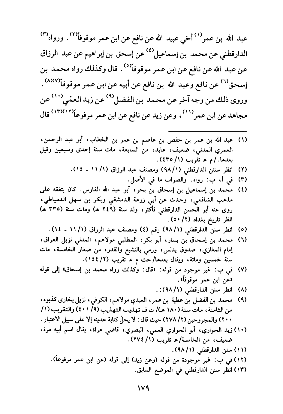 عبد الله بن عمر أخي عبيد الله عَن نَافِع عَن ابْن عمر مَوْقُوفا. وَرَوَاهُ الدَّارَقُطْنِيّ عَن مُحَمَّد بن إِسْمَاعِيل عَن إِسْحَق بن إِبْرَاهِيم عَن عبد الرَّزَّاق عَن عبد الله عَن نَافِع عَن ابْن عمر مَوْقُوفا. قَالَ وَكَذَلِكَ رَوَاهُ مُحَمَّد بن إِسْحَق عَن نَافِع وَعبد الله بن نَافِع عَن أَبِيه عَن ابْن عمر مَوْقُوفا. وروى ذَلِك من وَجه آخر عَن مُحَمَّد بن الْفضل عَن زيد الْعمي عَن مُجَاهِد عَن ابْن عمر، وَعَن زيد عَن نَافِع عَن ابْن عمر مَرْفُوعا قَالَ