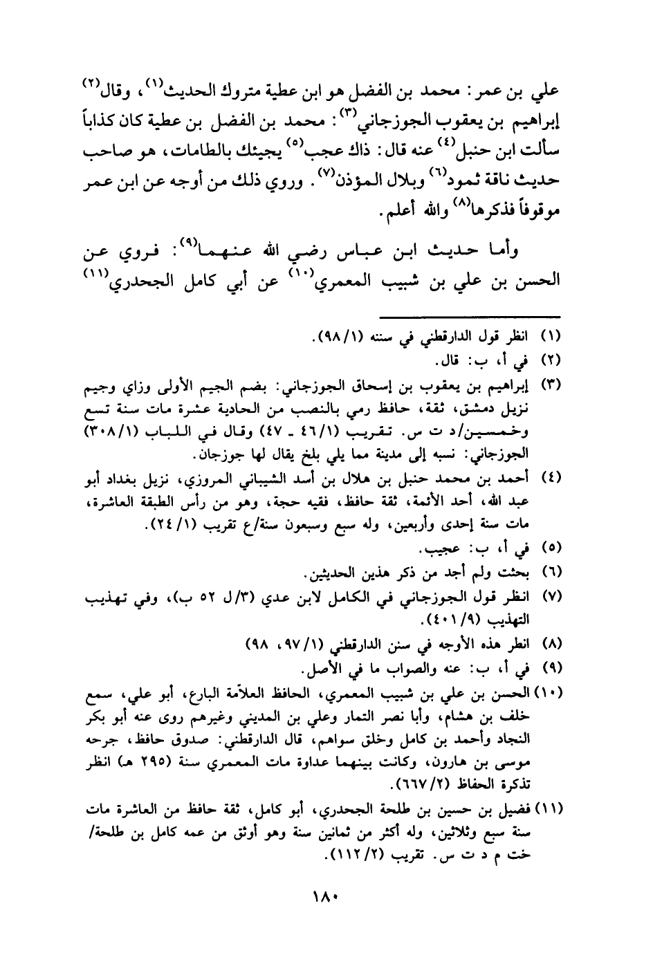 عَليّ بن عمر: مُحَمَّد بن الْفضل هُوَ ابْن عَطِيَّة مَتْرُوك الحَدِيث، وَقَالَ إِبْرَاهِيم بن يَعْقُوب الْجوزجَاني: مُحَمَّد بن الْفضل بن عَطِيَّة كَانَ كذابا سَأَلت ابْن حَنْبَل عَنهُ قَالَ: ذَاك عجب يجيئك بالطامات، هُوَ صَاحب حَدِيث نَاقَة ثَمُود وبلال الْمُؤَذّن. وَرُوِيَ ذَلِك من أوجه عَن ابْن عمر مَوْقُوفا فَذكرهَا وَالله أعلم. وَأما حَدِيث ابْن عَبَّاس رَضِي الله عَنْهُمَا: فَروِيَ عَن الْحسن بن عَليّ بن شبيب المعمري عَن أبي كَامِل الجحدري