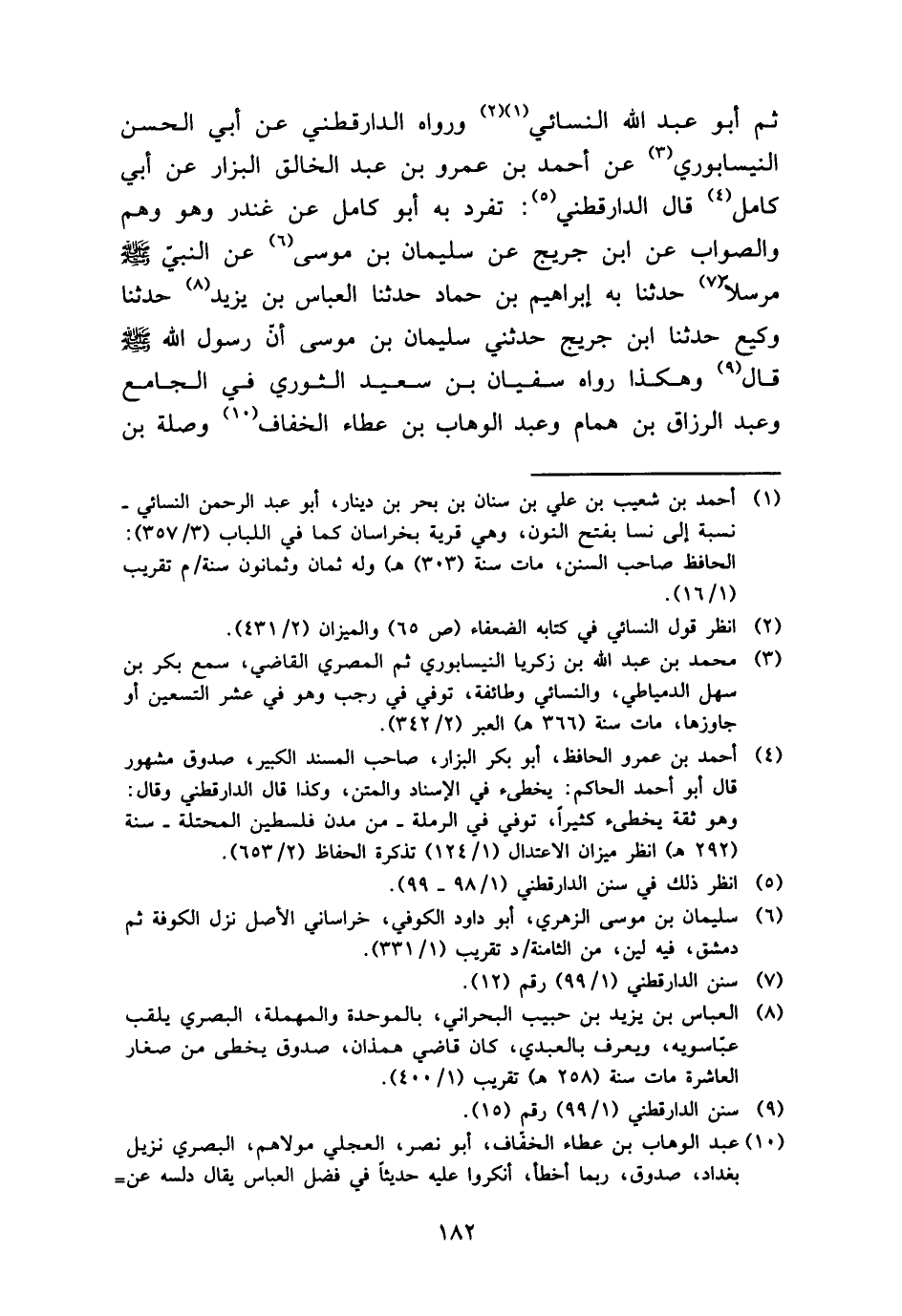 ثمَّ أَبُو عبد الله النَّسَائِيّ وَرَوَاهُ الدَّارَقُطْنِيّ عَن أبي الْحسن النَّيْسَابُورِي عَن أَحْمد بن عَمْرو بن عبد الْخَالِق الْبَزَّار عَن أبي كَامِل قَالَ الدَّارَقُطْنِيّ: تفرد بِهِ أَبُو كَامِل عَن غنْدر وَهُوَ وهم وَالصَّوَاب عَن ابْن جريج عَن سُلَيْمَان بن مُوسَى عَن النَّبِي - صَلَّى اللَّهُ عَلَيْهِ وَسَلَّم َ - مُرْسلا حَدثنَا بِهِ إِبْرَاهِيم بن حَمَّاد حَدثنَا الْعَبَّاس بن يزِيد حَدثنَا وَكِيع حَدثنَا ابْن جريج حَدثنِي سُلَيْمَان بن مُوسَى أَن رَسُول الله - صَلَّى اللَّهُ عَلَيْهِ وَسَلَّم َ - قَالَ وَهَكَذَا رَوَاهُ سُفْيَان بن سعيد الثَّوْريّ فِي الْجَامِع وَعبد الرَّزَّاق بن همام وَعبد الْوَهَّاب بن عَطاء الْخفاف وصلَة بن