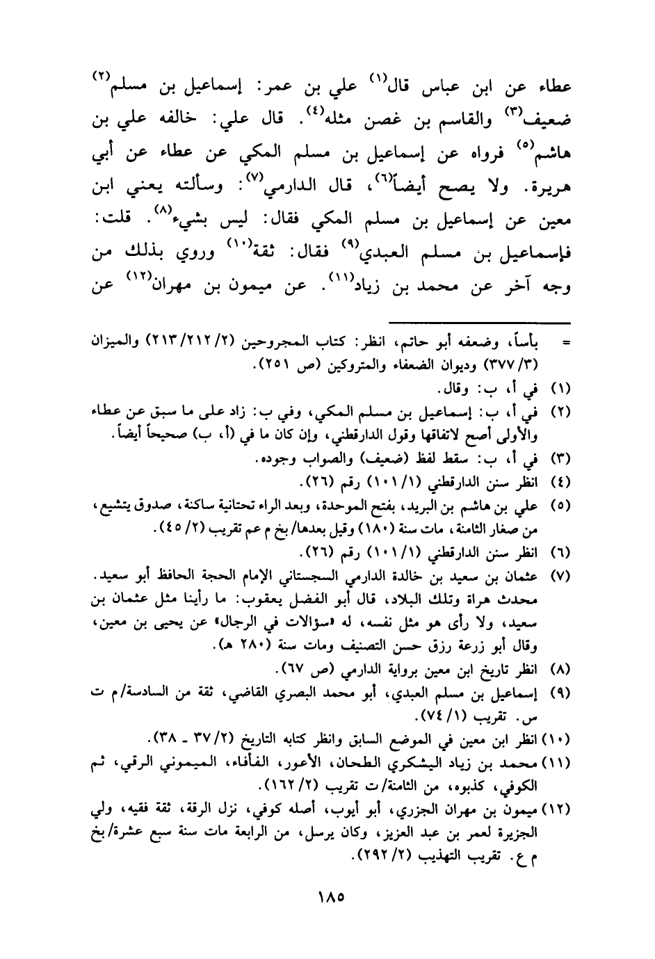 عَطاء عَن ابْن عَبَّاس قَالَ عَليّ بن عمر: إِسْمَاعِيل بن مُسلم ضَعِيف وَالقَاسِم بن غُصْن مثله. قَالَ عَليّ: خَالفه عَليّ بن هَاشم فَرَوَاهُ عَن إِسْمَاعِيل بن مُسلم الْمَكِّيّ عَن عَطاء عَن أبي هُرَيْرَة. وَلَا يَصح أَيْضا، قَالَ الدَّارمِيّ: وَسَأَلته يَعْنِي ابْن معِين عَن إِسْمَاعِيل بن مُسلم الْمَكِّيّ فَقَالَ: لَيْسَ بِشَيْء. قلت: فإسماعيل بن مُسلم الْعَبْدي فَقَالَ: ثِقَة وَرُوِيَ بذلك من وَجه آخر عَن مُحَمَّد بن زِيَاد. عَن مَيْمُون بن مهْرَان عَن
