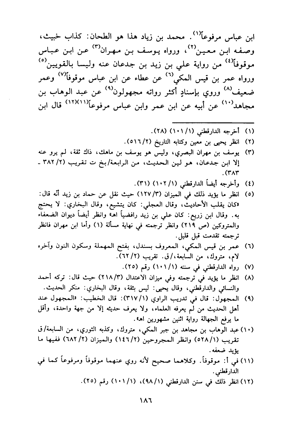 ابْن عَبَّاس مَرْفُوعا. مُحَمَّد بن زِيَاد هَذَا هُوَ الطَّحَّان: كَذَّاب خَبِيث، وَصفه ابْن معِين، وَرَوَاهُ يُوسُف بن مهْرَان عَن ابْن عَبَّاس مَوْقُوفا من رِوَايَة عَليّ بن زيد بن جدعَان عَنهُ وليسا بالقويين وَرَوَاهُ عمر بن قيس الْمَكِّيّ عَن عَطاء عَن ابْن عَبَّاس مَوْقُوفا وَعمر ضَعِيف وَرُوِيَ بِإِسْنَاد أَكثر رُوَاته مَجْهُولُونَ عَن عبد الْوَهَّاب بن مُجَاهِد عَن أَبِيه عَن ابْن عمر وَابْن عَبَّاس مَرْفُوعا قَالَ ابْن