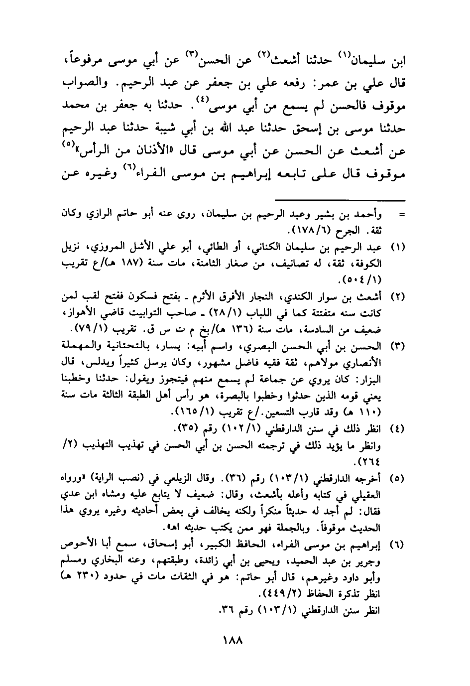 ابْن سُلَيْمَان حَدثنَا أَشْعَث عَن الْحسن عَن أبي مُوسَى مَرْفُوعا، قَالَ عَليّ بن عمر: رَفعه عَليّ بن جَعْفَر عَن عبد الرَّحِيم. وَالصَّوَاب مَوْقُوف فالحسن لم يسمع من أبي مُوسَى. حَدثنَا بِهِ جَعْفَر بن مُحَمَّد حَدثنَا مُوسَى بن إِسْحَق حَدثنَا عبد الله بن أبي شيبَة حَدثنَا عبد الرَّحِيم عَن أَشْعَث عَن الْحسن عَن أبي مُوسَى قَالَ " الأذنان من الرَّأْس " مَوْقُوف قَالَ على تَابعه إِبْرَاهِيم بن مُوسَى الْفراء وَغَيره عَن