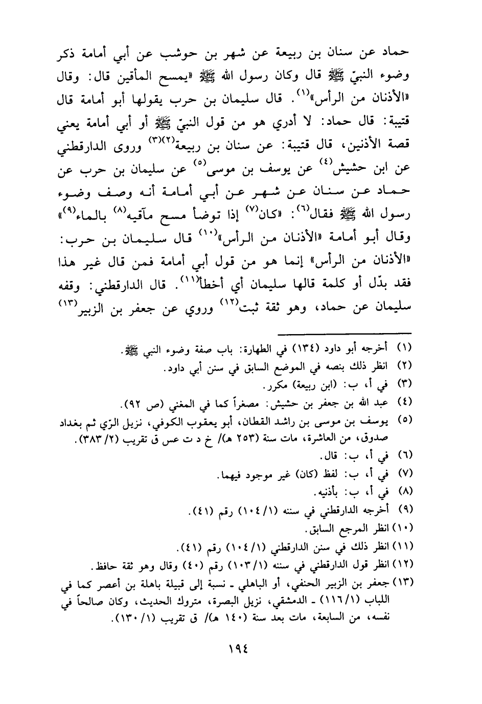 حَمَّاد عَن سِنَان بن ربيعَة عَن شهر بن حَوْشَب عَن أبي أُمَامَة ذكر وضوء النَّبِي - صَلَّى اللَّهُ عَلَيْهِ وَسَلَّم َ - قَالَ وَكَانَ رَسُول الله - صَلَّى اللَّهُ عَلَيْهِ وَسَلَّم َ - " يمسح المأقين قَالَ: وَقَالَ " الأذنان من الرَّأْس ". قَالَ سُلَيْمَان بن حَرْب يَقُولهَا أَبُو أُمَامَة قَالَ قُتَيْبَة: قَالَ حَمَّاد: لَا أَدْرِي هُوَ من قَول النَّبِي - صَلَّى اللَّهُ عَلَيْهِ وَسَلَّم َ - أَو أبي أُمَامَة يَعْنِي قصَّة الْأُذُنَيْنِ، قَالَ قُتَيْبَة: عَن سِنَان بن ربيعَة وروى الدَّارَقُطْنِيّ عَن ابْن حشيش عَن يُوسُف بن مُوسَى عَن سُلَيْمَان بن حَرْب عَن حَمَّاد عَن سِنَان عَن شهر عَن أبي أُمَامَة أَنه وصف وضوء رَسُول الله - صَلَّى اللَّهُ عَلَيْهِ وَسَلَّم َ - فَقَالَ: " كَانَ إِذا تَوَضَّأ مسح مآقيه بِالْمَاءِ " وَقَالَ أَبُو أُمَامَة " الأذنان من الرَّأْس " قَالَ سُلَيْمَان بن حَرْب: " الأذنان من الرَّأْس " إِنَّمَا هُوَ من قَول أبي أُمَامَة فَمن قَالَ غير هَذَا فقد بدل أَو كلمة قَالَهَا سُلَيْمَان أَي أَخطَأ. قَالَ الدَّارَقُطْنِيّ: وَقفه سُلَيْمَان عَن حَمَّاد، وَهُوَ ثِقَة ثَبت وَرُوِيَ عَن جَعْفَر بن الزبير