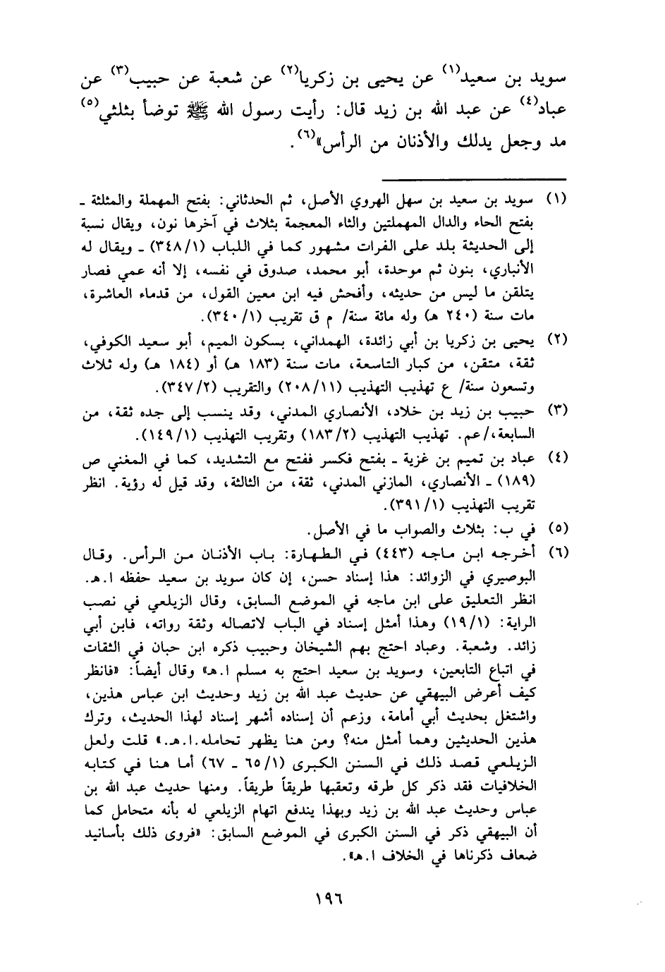 سُوَيْد بن سعيد عَن يحيى بن زَكَرِيَّا عَن شُعْبَة عَن حبيب عَن عباد عَن عبد الله بن زيد قَالَ: رَأَيْت رَسُول الله - صَلَّى اللَّهُ عَلَيْهِ وَسَلَّم َ - تَوَضَّأ بِثُلثي مد وَجعل يدلك والأذنان من الرَّأْس ".
