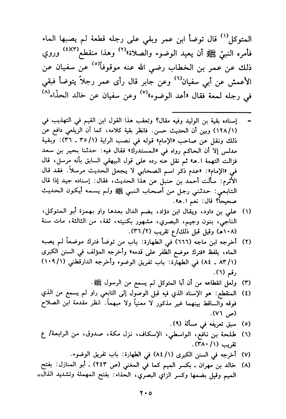 المتَوَكل قَالَ تَوَضَّأ ابْن عمر وَبَقِي على رجله قِطْعَة لم يصبهَا المَاء فَأمره النَّبِي - صَلَّى اللَّهُ عَلَيْهِ وَسَلَّم َ - أَن يُعِيد الْوضُوء وَالصَّلَاة " وَهَذَا مُنْقَطع وَرُوِيَ ذَلِك عَن عمر بن الْخطاب رَضِي الله عَنهُ مَوْقُوفا عَن سُفْيَان عَن الْأَعْمَش عَن أبي سُفْيَان وَعَن جَابر قَالَ رأى عمر رجلا يتَوَضَّأ فَبَقيَ فِي رجله لمْعَة فَقَالَ " أعد الْوضُوء " وَعَن سُفْيَان عَن خَالِد الْحذاء