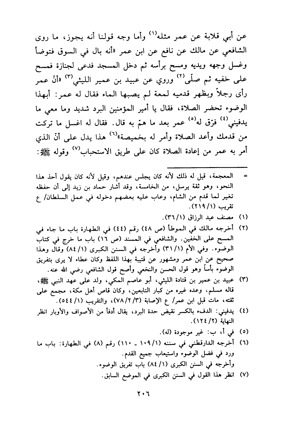 عَن أبي قلَابَة عَن عمر مثله وَأما وَجه قَوْلنَا أَنه يجوز، مَا روى الشَّافِعِي عَن مَالك عَن نَافِع عَن ابْن عمر " أَنه بَال فِي السُّوق فَتَوَضَّأ وَغسل وَجهه وَيَديه وَمسح بِرَأْسِهِ ثمَّ دخل الْمَسْجِد فدعى لجنازة فَمسح على خفيه ثمَّ صلى وَرُوِيَ عَن عبيد بن عُمَيْر اللَّيْثِيّ " أَن عمر رأى رجلا وبظهر قَدَمَيْهِ لمْعَة لم يصبهَا المَاء فَقَالَ لَهُ عمر: أَبِهَذَا الْوضُوء تحضر الصَّلَاة، فَقَالَ يَا أَمِير الْمُؤمنِينَ الْبرد شَدِيد وَمَا معي مَا يدفيني فرق لَهُ عمر بعد مَا هم بِهِ قَالَ. فَقَالَ لَهُ اغسل مَا تركت من قدمك وَأعد الصَّلَاة وَأمر لَهُ بخميصة " هَذَا يدل على أَن الَّذِي أَمر بِهِ عمر من إِعَادَة الصَّلَاة كَانَ على طَرِيق الِاسْتِحْبَاب وَقَوله - صَلَّى اللَّهُ عَلَيْهِ وَسَلَّم َ -: