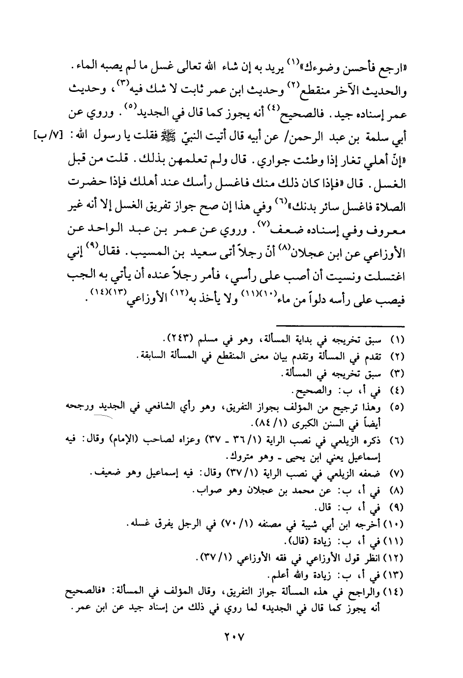 " ارْجع فَأحْسن وضوءك " يُرِيد بِهِ إِن شَاءَ الله تَعَالَى غسل مَا لم يصبهُ المَاء. والْحَدِيث الآخر مُنْقَطع وَحَدِيث ابْن عمر ثَابت لَا شكّ فِيهِ، وَحَدِيث عمر إِسْنَاده جيد. فَالصَّحِيح أَنه يجوز كَمَا قَالَ فِي الْجَدِيد. وَرُوِيَ عَن أبي سَلمَة بن عبد الرَّحْمَن عَن أَبِيه قَالَ أتيت النَّبِي - صَلَّى اللَّهُ عَلَيْهِ وَسَلَّم َ - فَقلت يَا رَسُول الله: " إِن أَهلِي تغار إِذا وطِئت جواري. قَالَ وَلم تعلمهن بذلك. قلت من قبل الْغسْل. قَالَ " فَإِذا كَانَ ذَلِك مِنْك فاغسل رَأسك عِنْد أهلك فَإِذا حضرت الصَّلَاة فاغسل سَائِر بدنك " وَفِي هَذَا إِن صَحَّ جَوَاز تَفْرِيق الْغسْل إِلَّا أَنه غير مَعْرُوف وَفِي إِسْنَاده ضعف. وَرُوِيَ عَن عمر بن عبد الْوَاحِد عَن الْأَوْزَاعِيّ عَن ابْن عجلَان أَن رجلا أَتَى سعيد بن الْمسيب. فَقَالَ إِنِّي اغْتَسَلت ونسيت أَن أصب على رَأْسِي، فَأمر رجلا عِنْده أَن يَأْتِي بِهِ الْجب فَيصب على رَأسه دلوا من مَاء وَلَا يَأْخُذ بِهِ الْأَوْزَاعِيّ.