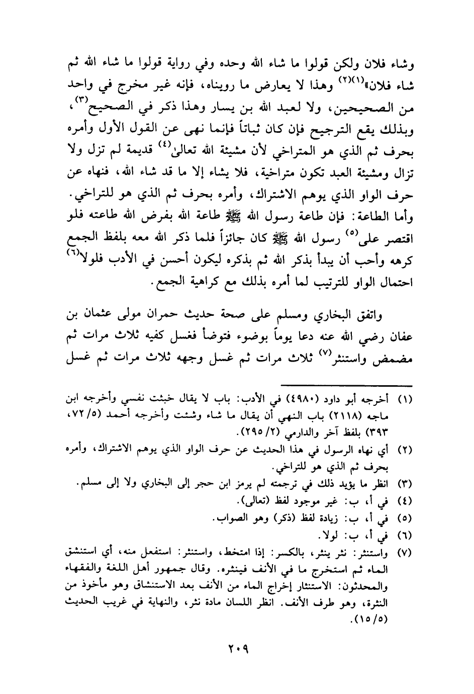 وَشاء فلَان وَلَكِن قُولُوا مَا شَاءَ الله وَحده وَفِي رِوَايَة قُولُوا مَا شَاءَ الله ثمَّ شَاءَ فلَان " وَهَذَا لَا يُعَارض مَا روينَاهُ، فَإِنَّهُ غير مخرج فِي وَاحِد من الصَّحِيحَيْنِ، وَلَا لعبد الله بن يسَار وَهَذَا ذكر فِي الصَّحِيح، وَبِذَلِك يَقع التَّرْجِيح فَإِن كَانَ ثباتا فَإِنَّمَا نهى عَن القَوْل الأول وَأمره بِحرف ثمَّ الَّذِي هُوَ المتراخي لِأَن مَشِيئَة الله تَعَالَى قديمَة لم تزل وَلَا تزَال ومشيئة العَبْد تكون متراخية، فَلَا يَشَاء إِلَّا مَا قد شَاءَ الله، فَنَهَاهُ عَن حرف الْوَاو الَّذِي يُوهم الِاشْتِرَاك، وَأمره بِحرف ثمَّ الَّذِي هُوَ للتراخي. وَأما الطَّاعَة: فَإِن طَاعَة رَسُول الله - صَلَّى اللَّهُ عَلَيْهِ وَسَلَّم َ - طَاعَة الله بِفَرْض الله طَاعَته فَلَو اقْتصر على رَسُول الله - صَلَّى اللَّهُ عَلَيْهِ وَسَلَّم َ - كَانَ جَائِزا فَلَمَّا ذكر الله مَعَه بِلَفْظ الْجمع كرهه وَأحب أَن يبْدَأ بِذكر الله ثمَّ بِذكرِهِ ليَكُون أحسن فِي الْأَدَب فلولا احْتِمَال الْوَاو للتَّرْتِيب لما أمره بذلك مَعَ كَرَاهِيَة الْجمع.