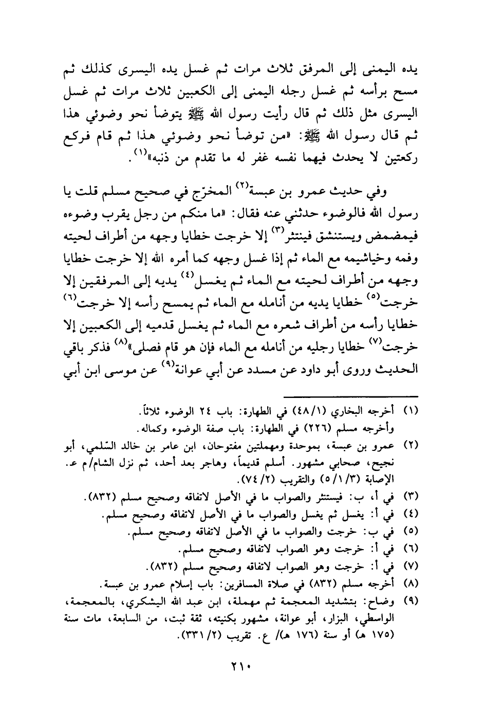 وَفِي حَدِيث عَمْرو بن عبسة الْمخْرج فِي صَحِيح مُسلم قلت يَا رَسُول الله فالوضوء حَدثنِي عَنهُ فَقَالَ: " مَا مِنْكُم من رجل يقرب وضوءه فيمضمض ويستنشق فينتثر إِلَّا خرجت خَطَايَا وَجهه من أَطْرَاف لحيته وفمه وخياشيمه مَعَ المَاء ثمَّ إِذا غسل وَجهه كَمَا أمره الله إِلَّا خرجت خَطَايَا وَجهه من أَطْرَاف لحيته مَعَ المَاء ثمَّ يغسل يَدَيْهِ إِلَى الْمرْفقين إِلَّا خرجت خَطَايَا يَدَيْهِ من أنامله مَعَ المَاء ثمَّ يمسح رَأسه إِلَّا خرجت خَطَايَا رَأسه من أَطْرَاف شعره مَعَ المَاء ثمَّ يغسل قَدَمَيْهِ إِلَى الْكَعْبَيْنِ إِلَّا خرجت خَطَايَا رجلَيْهِ من أنامله مَعَ المَاء فَإِن هُوَ قَامَ فصلى " فَذكر بَاقِي الحَدِيث وروى أَبُو دَاوُد عَن مُسَدّد عَن أبي عوَانَة عَن مُوسَى ابْن أبي