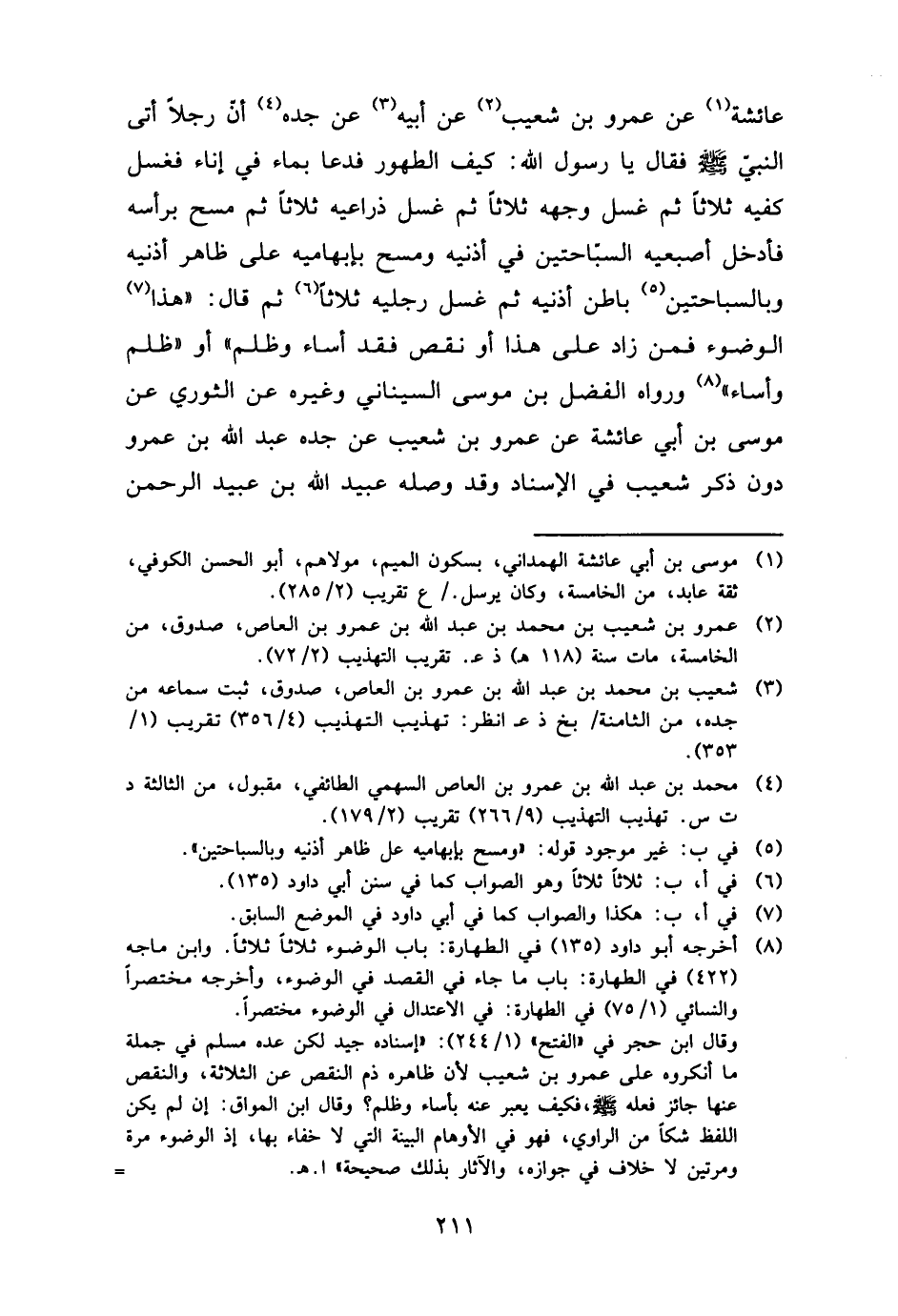 عَائِشَة عَن عَمْرو بن شُعَيْب عَن أَبِيه عَن جده أَن رجلا أَتَى النَّبِي - صَلَّى اللَّهُ عَلَيْهِ وَسَلَّم َ - فَقَالَ يَا رَسُول الله: كَيفَ الطّهُور فَدَعَا بِمَاء فِي إِنَاء فَغسل كفيه ثَلَاثًا ثمَّ غسل وَجهه ثَلَاثًا ثمَّ غسل ذِرَاعَيْهِ ثَلَاثًا ثمَّ مسح بِرَأْسِهِ فَأدْخل أصبعيه السباحتين فِي أُذُنَيْهِ وَمسح بإبهاميه على ظَاهر أُذُنَيْهِ وبالسباحتين بَاطِن أُذُنَيْهِ ثمَّ غسل رجلَيْهِ ثَلَاثًا ثمَّ قَالَ: " هَذَا الْوضُوء فَمن زَاد على هَذَا أَو نقص فقد أَسَاءَ وظلم " أَو " ظلم وأساء " وَرَوَاهُ الْفضل بن مُوسَى السينَانِي وَغَيره عَن الثَّوْريّ عَن مُوسَى بن أبي عَائِشَة عَن عَمْرو بن شُعَيْب عَن جده عبد الله بن عَمْرو دون ذكر شُعَيْب فِي الْإِسْنَاد وَقد وَصله عبيد الله بن عبيد الرَّحْمَن
