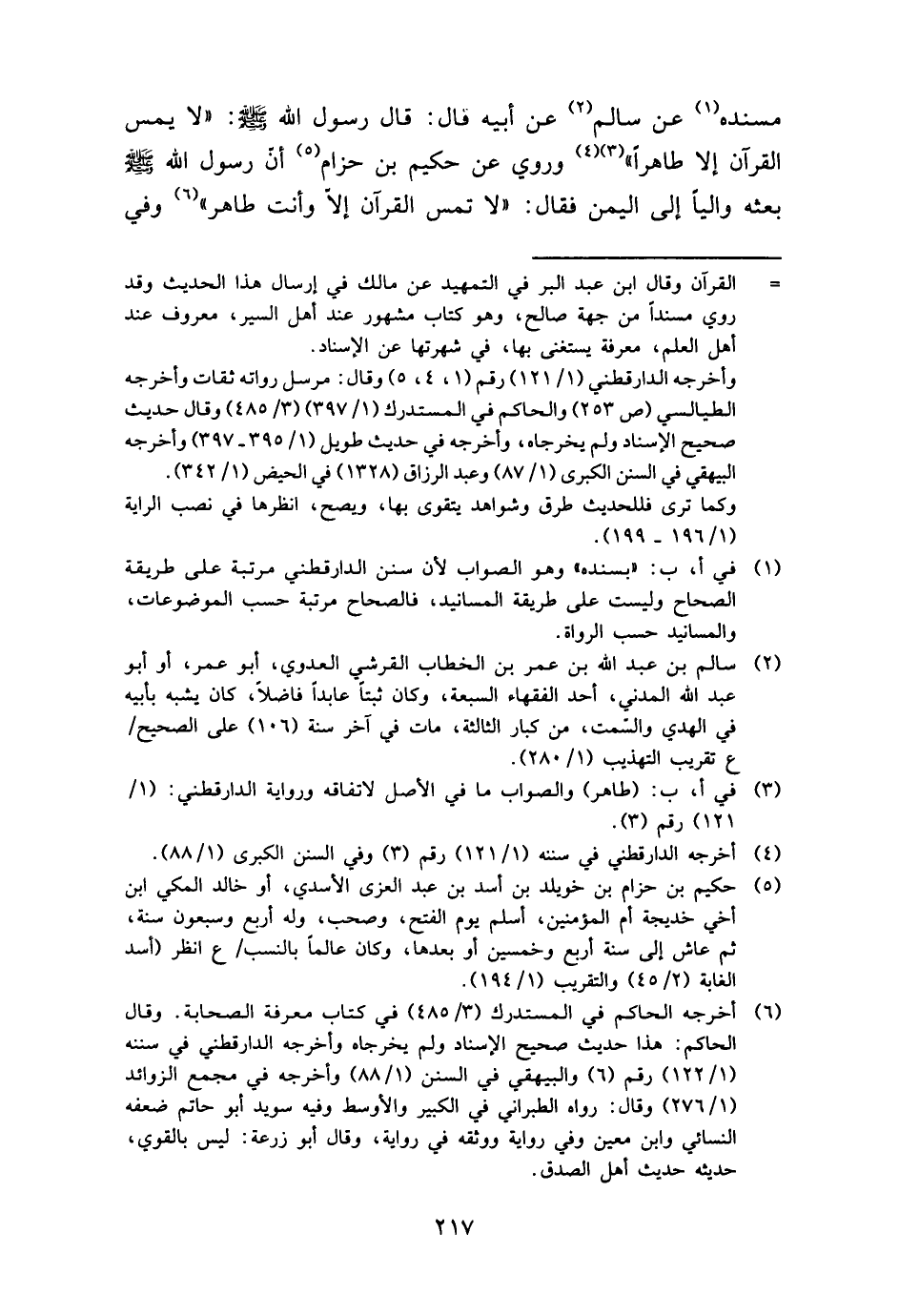 مُسْنده عَن سَالم عَن أَبِيه قَالَ: قَالَ رَسُول الله - صَلَّى اللَّهُ عَلَيْهِ وَسَلَّم َ -: " لَا يمس الْقُرْآن إِلَّا طَاهِرا " وَرُوِيَ عَن حَكِيم بن حزَام أَن رَسُول الله - صَلَّى اللَّهُ عَلَيْهِ وَسَلَّم َ - بَعثه واليا إِلَى الْيمن فَقَالَ: " لَا تمس الْقُرْآن إِلَّا وَأَنت طَاهِر " وَفِي