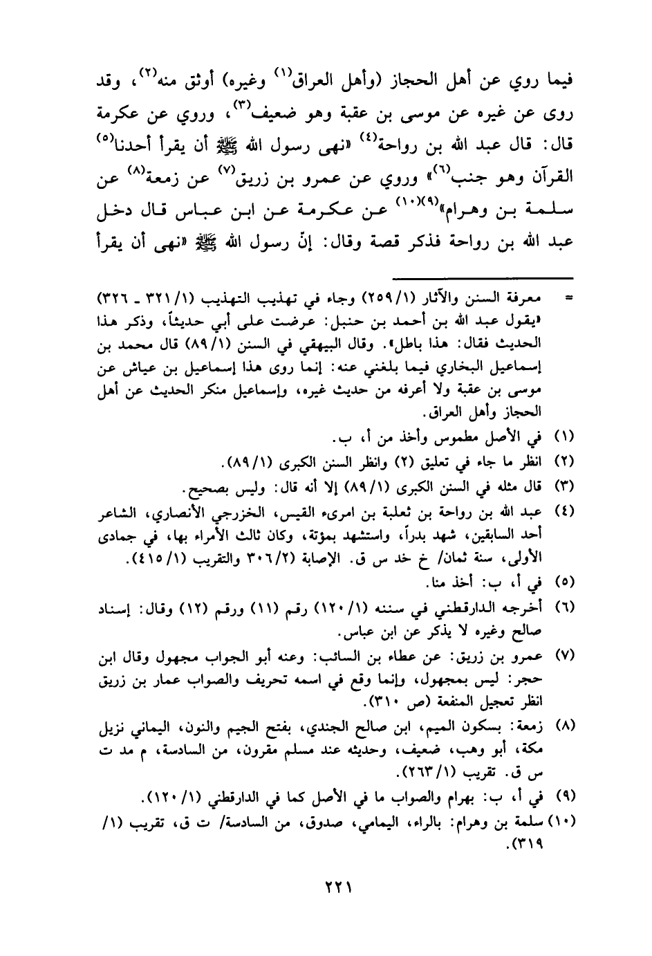 فِيمَا رُوِيَ عَن أهل الْحجاز (وَأهل الْعرَاق وَغَيره) أوثق مِنْهُ، وَقد روى عَن غَيره عَن مُوسَى بن عقبَة وَهُوَ ضَعِيف، وَرُوِيَ عَن عِكْرِمَة قَالَ: قَالَ عبد الله بن رَوَاحَة " نهى رَسُول الله - صَلَّى اللَّهُ عَلَيْهِ وَسَلَّم َ - أَن يقْرَأ أَحَدنَا الْقُرْآن وَهُوَ جنب " وَرُوِيَ عَن عَمْرو بن زُرَيْق عَن زَمعَة عَن سَلمَة بن وهرام " عَن عِكْرِمَة عَن ابْن عَبَّاس قَالَ دخل عبد الله بن رَوَاحَة فَذكر قصَّة وَقَالَ: إِن رَسُول الله - صَلَّى اللَّهُ عَلَيْهِ وَسَلَّم َ - " نهى أَن يقْرَأ