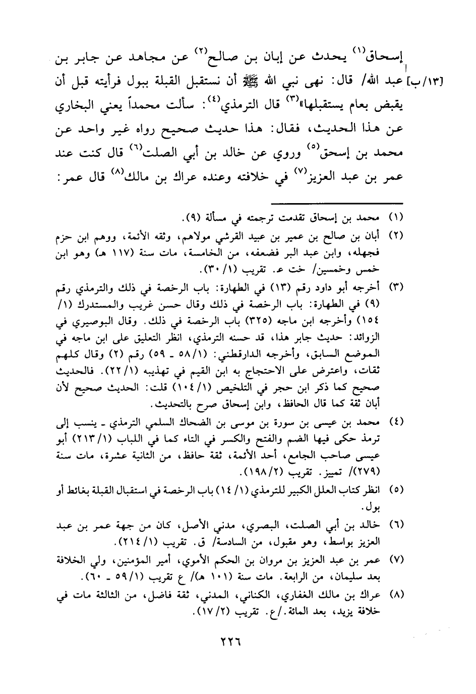 إِسْحَاق يحدث عَن إبان بن صَالح عَن مُجَاهِد عَن جَابر بن عبد الله قَالَ: نهى نَبِي الله - صَلَّى اللَّهُ عَلَيْهِ وَسَلَّم َ - أَن نستقبل الْقبْلَة ببول فرأيته قبل أَن يقبض بعام يستقبلها " قَالَ التِّرْمِذِيّ: سَأَلت مُحَمَّدًا يَعْنِي البُخَارِيّ عَن هَذَا الحَدِيث، فَقَالَ: هَذَا حَدِيث صَحِيح رَوَاهُ غير وَاحِد عَن مُحَمَّد بن إِسْحَق وَرُوِيَ عَن خَالِد بن أبي الصَّلْت قَالَ كنت عِنْد عمر بن عبد الْعَزِيز فِي خِلَافَته وَعِنْده عرَاك بن مَالك قَالَ عمر: