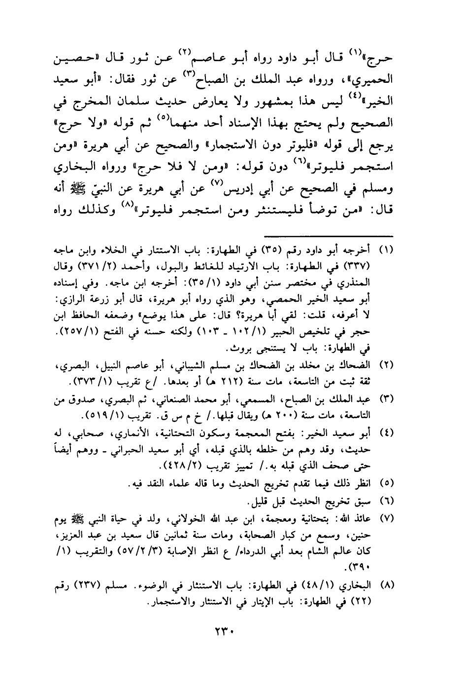 حرج " قَالَ أَبُو دَاوُد رَوَاهُ أَبُو عَاصِم عَن ثَوْر قَالَ " حُصَيْن الْحِمْيَرِي "، وَرَوَاهُ عبد الْملك بن الصَّباح عَن ثَوْر فَقَالَ: " أَبُو سعيد الْخَيْر " لَيْسَ هَذَا بِمَشْهُور وَلَا يُعَارض حَدِيث سلمَان الْمخْرج فِي الصَّحِيح وَلم يحْتَج بِهَذَا الْإِسْنَاد أحد مِنْهُمَا ثمَّ قَوْله " وَلَا حرج " يرجع إِلَى قَوْله " فليوتر دون الِاسْتِجْمَار " وَالصَّحِيح عَن أبي هُرَيْرَة " وَمن استجمر فليوتر " دون قَوْله: " وَمن لَا فَلَا حرج " وَرَوَاهُ البُخَارِيّ وَمُسلم فِي الصَّحِيح عَن أبي إِدْرِيس عَن أبي هُرَيْرَة عَن النَّبِي - صَلَّى اللَّهُ عَلَيْهِ وَسَلَّم َ - أَنه قَالَ: " من تَوَضَّأ فليستنثر وَمن استجمر فليوتر " وَكَذَلِكَ رَوَاهُ