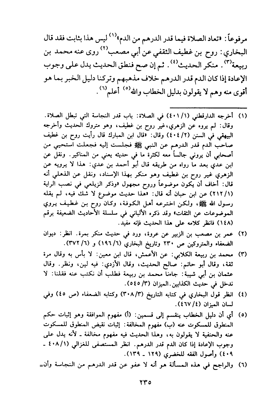 مَرْفُوعا: " تُعَاد الصَّلَاة فِيمَا قدر الدِّرْهَم من الدَّم " لَيْسَ هَذَا بِثَابِت فقد قَالَ البُخَارِيّ: روح بن غطيف الثَّقَفِيّ عَن أبي مُصعب روى عَنهُ مُحَمَّد بن ربيعَة. مُنكر الحَدِيث. ثمَّ إِن صَحَّ فَنَطَقَ الحَدِيث يدل على وجوب الْإِعَادَة إِذا كَانَ الدَّم قدر الدِّرْهَم خلاف مَذْهَبهم وَتَركنَا دَلِيل الْخَبَر بِمَا هُوَ أقوى مِنْهُ وهم لَا يَقُولُونَ بِدَلِيل الْخطاب وَالله أعلم.