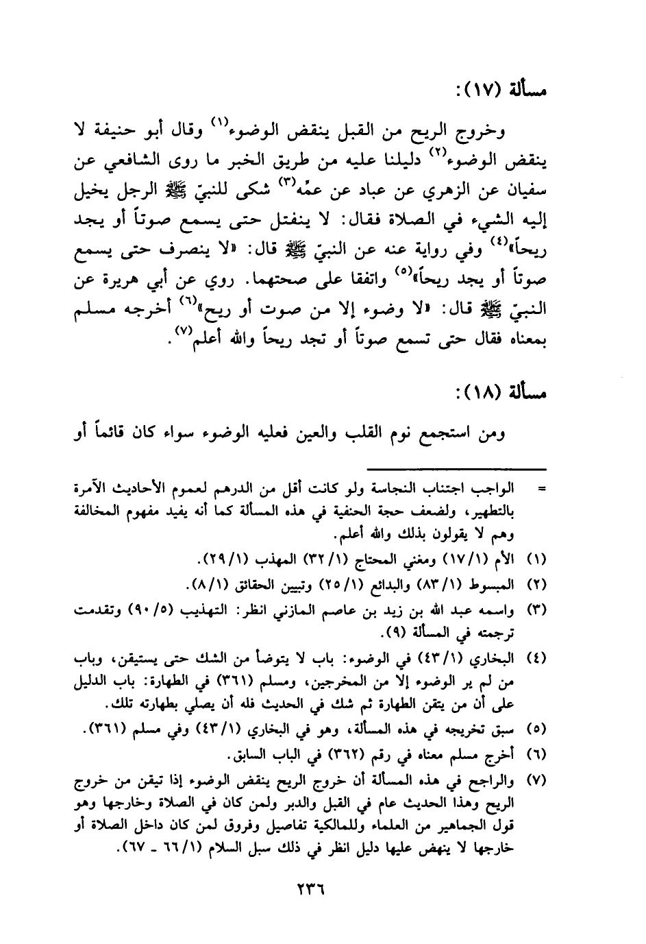وَخُرُوج الرّيح من الْقبل ينْقض الْوضُوء وَقَالَ أَبُو حنيفَة لَا ينْقض الْوضُوء دليلنا عَلَيْهِ من طَرِيق الْخَبَر مَا روى الشَّافِعِي عَن سُفْيَان عَن الزُّهْرِيّ عَن عباد عَن عَمه شكى للنَّبِي - صَلَّى اللَّهُ عَلَيْهِ وَسَلَّم َ - الرجل يخيل إِلَيْهِ الشَّيْء فِي الصَّلَاة فَقَالَ: لَا يَنْفَتِل حَتَّى يسمع صَوتا أَو يجد ريحًا " وَفِي رِوَايَة عَنهُ عَن النَّبِي - صَلَّى اللَّهُ عَلَيْهِ وَسَلَّم َ - قَالَ: " لَا ينْصَرف حَتَّى يسمع صَوتا أَو يجد ريحًا " واتفقا على صحتهما. رُوِيَ عَن أبي هُرَيْرَة عَن النَّبِي - صَلَّى اللَّهُ عَلَيْهِ وَسَلَّم َ - قَالَ: " لَا وضوء إِلَّا من صَوت أَو ريح " أخرجه مُسلم بِمَعْنَاهُ فَقَالَ حَتَّى تسمع صَوتا أَو تَجِد ريحًا وَالله أعلم.