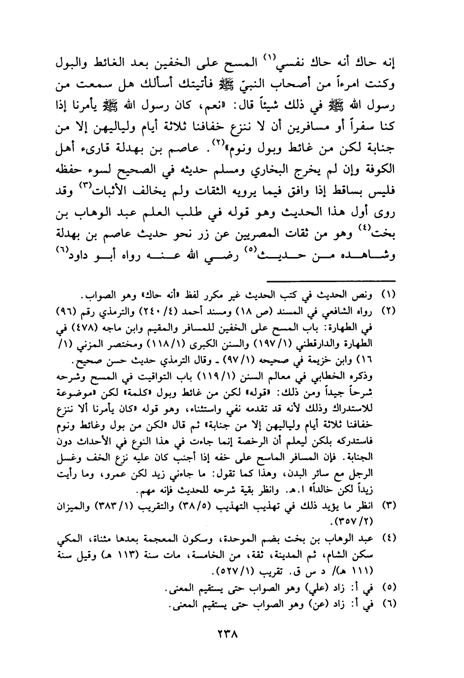 إِنَّه حاك أَنه حاك نَفسِي الْمسْح على الْخُفَّيْنِ بعد الْغَائِط وَالْبَوْل وَكنت امْرَءًا من أَصْحَاب النَّبِي - صَلَّى اللَّهُ عَلَيْهِ وَسَلَّم َ - فأتيتك أَسأَلك هَل سَمِعت من رَسُول الله - صَلَّى اللَّهُ عَلَيْهِ وَسَلَّم َ - فِي ذَلِك شَيْئا قَالَ: " نعم، كَانَ رَسُول الله - صَلَّى اللَّهُ عَلَيْهِ وَسَلَّم َ - يَأْمُرنَا إِذا كُنَّا سفرا أَو مسافرين أَن لَا ننزع خفافنا ثَلَاثَة أَيَّام ولياليهن إِلَّا من جَنَابَة لَكِن من غَائِط وَبَوْل ونوم ". عَاصِم بن بَهْدَلَة قَارِئ أهل الْكُوفَة وَإِن لم يخرج البُخَارِيّ وَمُسلم حَدِيثه فِي الصَّحِيح لسوء حفظه فَلَيْسَ بساقط إِذا وَافق فِيمَا يرويهِ الثِّقَات وَلم يُخَالف الْأَثْبَات وَقد روى أول هَذَا الحَدِيث وَهُوَ قَوْله فِي طلب الْعلم عبد الْوَهَّاب بن بخت وَهُوَ من ثِقَات المصريين عَن زر نَحْو حَدِيث عَاصِم بن بَهْدَلَة وَشَاهده من حَدِيث رَضِي الله عَنهُ رَوَاهُ أَبُو دَاوُد