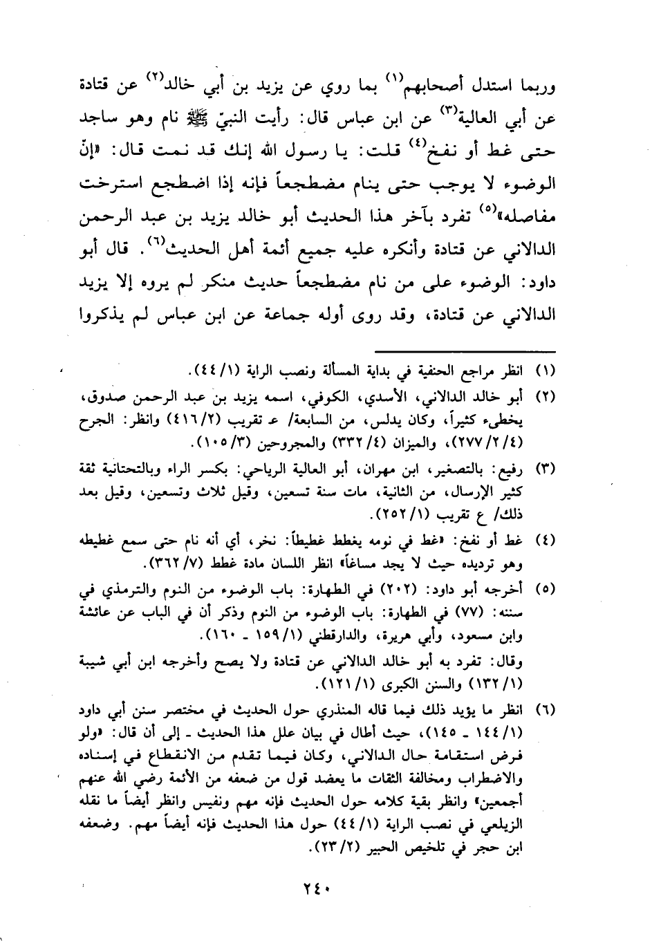 وَرُبمَا اسْتدلَّ أَصْحَابهم بِمَا رُوِيَ عَن يزِيد بن أبي خَالِد عَن قَتَادَة عَن أبي الْعَالِيَة عَن ابْن عَبَّاس قَالَ: رَأَيْت النَّبِي - صَلَّى اللَّهُ عَلَيْهِ وَسَلَّم َ - نَام وَهُوَ ساجد حَتَّى غط أَو نفخ قلت: يَا رَسُول الله إِنَّك قد نمت قَالَ: " إِن الْوضُوء لَا يُوجب حَتَّى ينَام مُضْطَجعا فَإِنَّهُ إِذا اضْطجع استرخت مفاصله " تفرد بآخر هَذَا الحَدِيث أَبُو خَالِد يزِيد بن عبد الرَّحْمَن الدالاني عَن قَتَادَة وَأنْكرهُ عَلَيْهِ جَمِيع أَئِمَّة أهل الحَدِيث. قَالَ أَبُو دَاوُد: الْوضُوء على من نَام مُضْطَجعا حَدِيث مُنكر لم يروه إِلَّا يزِيد الدالاني عَن قَتَادَة، وَقد روى أَوله جمَاعَة عَن ابْن عَبَّاس لم يذكرُوا