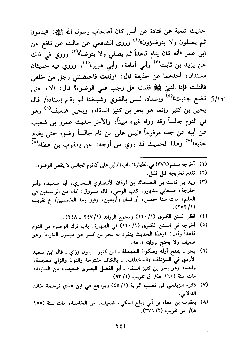 حَدِيث شُعْبَة عَن قَتَادَة عَن أنس كَانَ أَصْحَاب رَسُول الله - صَلَّى اللَّهُ عَلَيْهِ وَسَلَّم َ -: " ينامون ثمَّ يصلونَ وَلَا يتوضؤون " وروى الشَّافِعِي عَن مَالك عَن نَافِع عَن ابْن عمر " أَنه كَانَ ينَام قَاعِدا ثمَّ يُصَلِّي وَلَا يتَوَضَّأ " وَرُوِيَ فِي ذَلِك عَن يزِيد بن ثَابت وَأبي أُمَامَة، وَأبي هُرَيْرَة، وَرُوِيَ فِيهِ حديثان مسندان، أَحدهمَا عَن حُذَيْفَة قَالَ: " رقدت فاحتضنني رجل من خَلْفي فَالْتَفت فَإِذا النَّبِي - صَلَّى اللَّهُ عَلَيْهِ وَسَلَّم َ - فَقلت هَل وَجب عَليّ الْوضُوء؟ قَالَ: " لَا، حَتَّى تضع جَنْبك " وَإِسْنَاده لَيْسَ بِالْقَوِيّ وَشَيخنَا لم يقم إِسْنَاده قَالَ يحيى بن كثير وَإِنَّمَا هُوَ بَحر بن كنيز السقاء، وَيحيى ضَعِيف وَهُوَ فِي النّوم جَالِسا وَقد رَوَاهُ غَيره مُبينًا، وَالْآخر حَدِيث عَمْرو بن شُعَيْب عَن أَبِيه عَن جده مَرْفُوعا " لَيْسَ على من نَام جَالِسا وضوء حَتَّى يضع جنبه " وَهَذَا الحَدِيث قد رُوِيَ من أوجه: عَن يَعْقُوب بن عَطاء