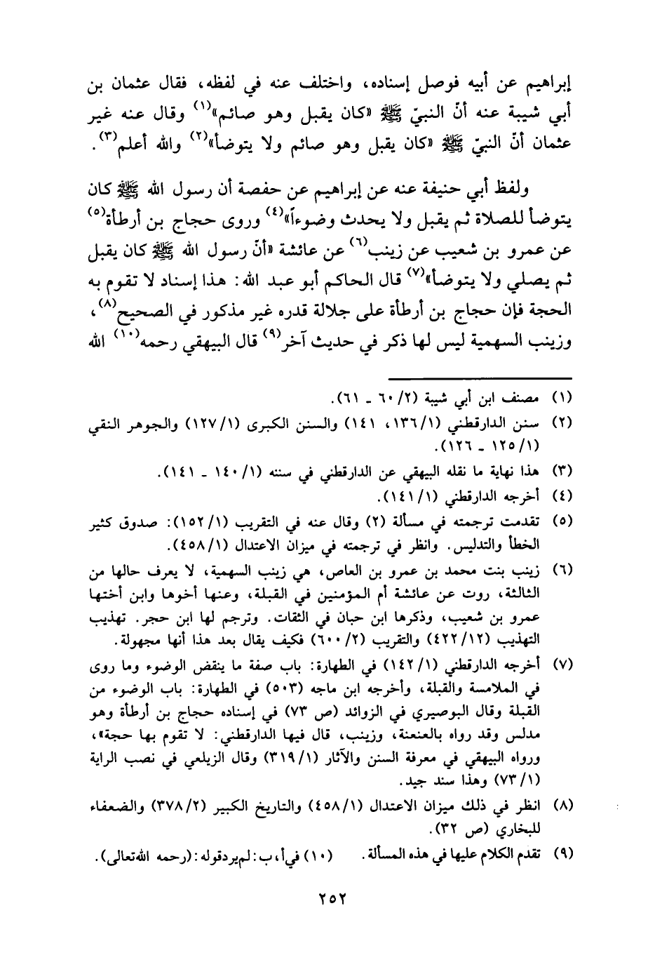 وَلَفظ أبي حنيفَة عَنهُ عَن إِبْرَاهِيم عَن حَفْصَة أَن رَسُول الله - صَلَّى اللَّهُ عَلَيْهِ وَسَلَّم َ - كَانَ يتَوَضَّأ للصَّلَاة ثمَّ يقبل وَلَا يحدث وضُوءًا " وروى حجاج بن أَرْطَأَة عَن عَمْرو بن شُعَيْب عَن زَيْنَب عَن عَائِشَة " أَن رَسُول الله - صَلَّى اللَّهُ عَلَيْهِ وَسَلَّم َ - كَانَ يقبل ثمَّ يُصَلِّي وَلَا يتَوَضَّأ " قَالَ الْحَاكِم أَبُو عبد الله: هَذَا إِسْنَاد لَا تقوم بِهِ الْحجَّة فَإِن حجاج بن أَرْطَأَة على جلالة قدره غير مَذْكُور فِي الصَّحِيح، وَزَيْنَب السهمية لَيْسَ لَهَا ذكر فِي حَدِيث آخر قَالَ الْبَيْهَقِيّ رَحمَه الله