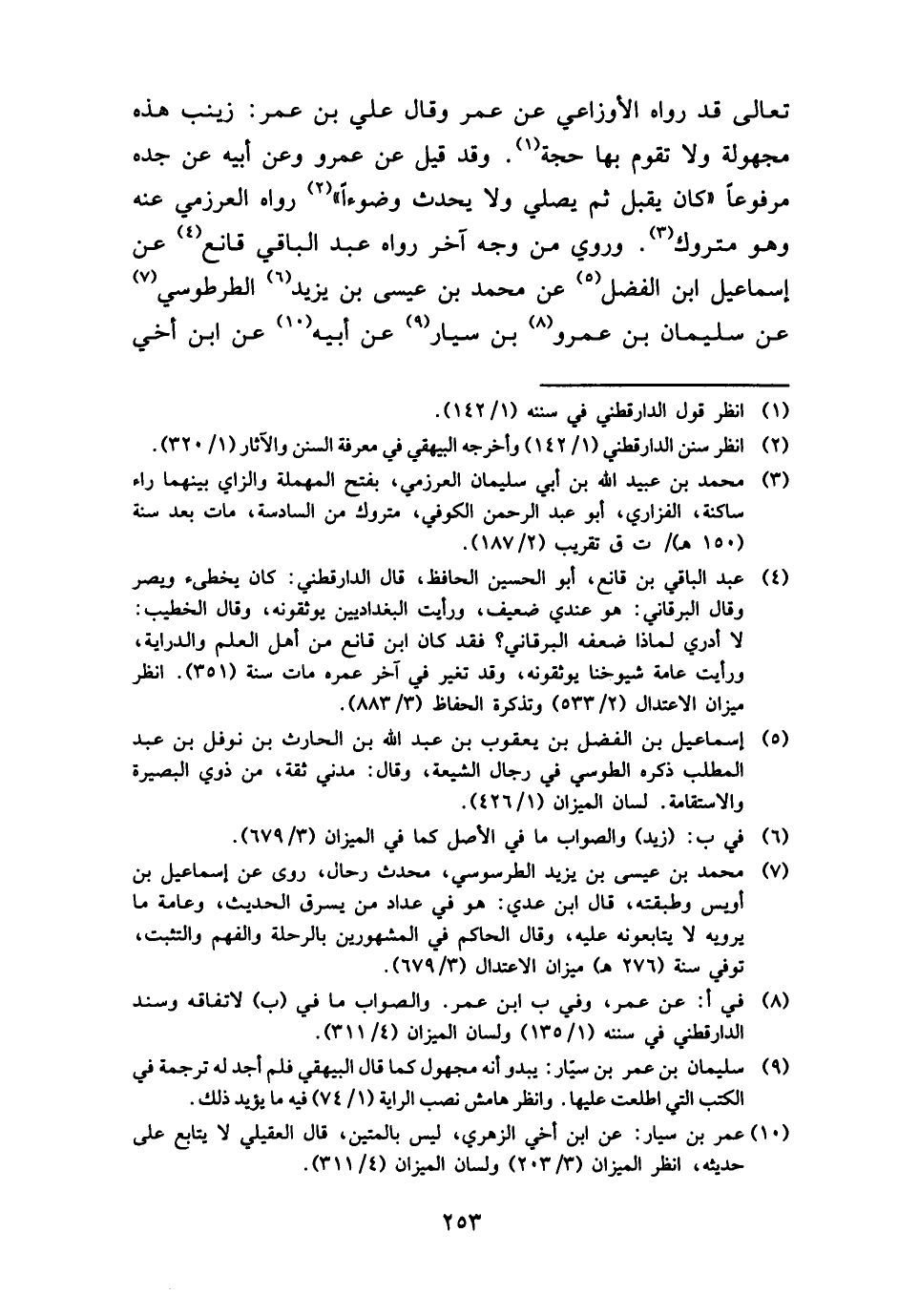 تَعَالَى قد رَوَاهُ الْأَوْزَاعِيّ عَن عمر وَقَالَ عَليّ بن عمر: زَيْنَب هَذِه مَجْهُولَة وَلَا تقوم بهَا حجَّة. وَقد قيل عَن عَمْرو وَعَن أَبِيه عَن جده مَرْفُوعا " كَانَ يقبل ثمَّ يُصَلِّي وَلَا يحدث وضُوءًا " رَوَاهُ الْعَرْزَمِي عَنهُ وَهُوَ مَتْرُوك. وَرُوِيَ من وَجه آخر رَوَاهُ عبد الْبَاقِي قَانِع عَن إِسْمَاعِيل ابْن الْفضل عَن مُحَمَّد بن عِيسَى بن يزِيد الطرطوسي عَن سُلَيْمَان بن عَمْرو بن سيار عَن أَبِيه عَن ابْن أخي
