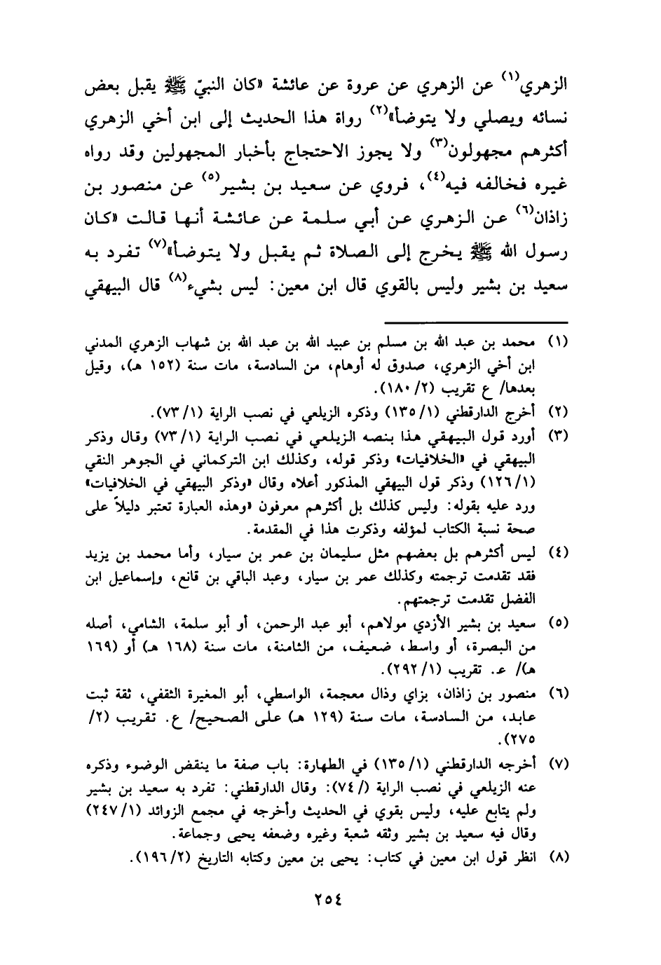 الزُّهْرِيّ عَن الزُّهْرِيّ عَن عُرْوَة عَن عَائِشَة " كَانَ النَّبِي - صَلَّى اللَّهُ عَلَيْهِ وَسَلَّم َ - يقبل بعض نِسَائِهِ وَيُصلي وَلَا يتَوَضَّأ " رُوَاة هَذَا الحَدِيث إِلَى ابْن أخي الزُّهْرِيّ أَكْثَرهم مَجْهُولُونَ وَلَا يجوز الِاحْتِجَاج بأخبار المجهولين وَقد رَوَاهُ غَيره فخالفه فِيهِ، فَروِيَ عَن سعيد بن بشير عَن مَنْصُور بن زَاذَان عَن الزُّهْرِيّ عَن أبي سَلمَة عَن عَائِشَة أَنَّهَا قَالَت " كَانَ رَسُول الله - صَلَّى اللَّهُ عَلَيْهِ وَسَلَّم َ - يخرج إِلَى الصَّلَاة ثمَّ يقبل وَلَا يتَوَضَّأ " تفرد بِهِ سعيد بن بشير وَلَيْسَ بِالْقَوِيّ قَالَ ابْن معِين: لَيْسَ بِشَيْء قَالَ الْبَيْهَقِيّ