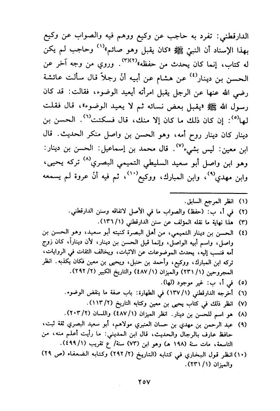 الدَّارَقُطْنِيّ: تفرد بِهِ حَاجِب عَن وَكِيع وَوهم فِيهِ وَالصَّوَاب عَن وَكِيع بِهَذَا الْإِسْنَاد أَن النَّبِي - صَلَّى اللَّهُ عَلَيْهِ وَسَلَّم َ - " كَانَ يقبل وَهُوَ صَائِم " وحاجب لم يكن لَهُ كتاب، إِنَّمَا كَانَ يحدث من حفظه ". وَرُوِيَ من وَجه آخر عَن الْحسن بن دِينَار عَن هِشَام عَن أَبِيه أَن رجلا قَالَ سَأَلت عَائِشَة رَضِي الله عَنْهَا عَن الرجل يقبل امْرَأَته أيعيد الْوضُوء، فَقَالَت: قد كَانَ رَسُول الله - صَلَّى اللَّهُ عَلَيْهِ وَسَلَّم َ - " يقبل بعض نِسَائِهِ ثمَّ لَا يُعِيد الْوضُوء "، قَالَ فَقلت لَهَا: إِن كَانَ ذَلِك مَا كَانَ إِلَّا مِنْك، قَالَ فَسَكَتَتْ. الْحسن بن دِينَار كَانَ دِينَار روح أمه، وَهُوَ الْحسن بن وَاصل مُنكر الحَدِيث. قَالَ ابْن معِين: لَيْسَ بِشَيْء. قَالَ مُحَمَّد بن إِسْمَاعِيل: الْحسن بن دِينَار: وَهُوَ ابْن وَاصل أَبُو سعيد السليطي التَّمِيمِي الْبَصْرِيّ تَركه يحيى، وَابْن مهْدي، وَابْن الْمُبَارك، ووكيع، ثمَّ فِيهِ أَن عُرْوَة لم يسمعهُ