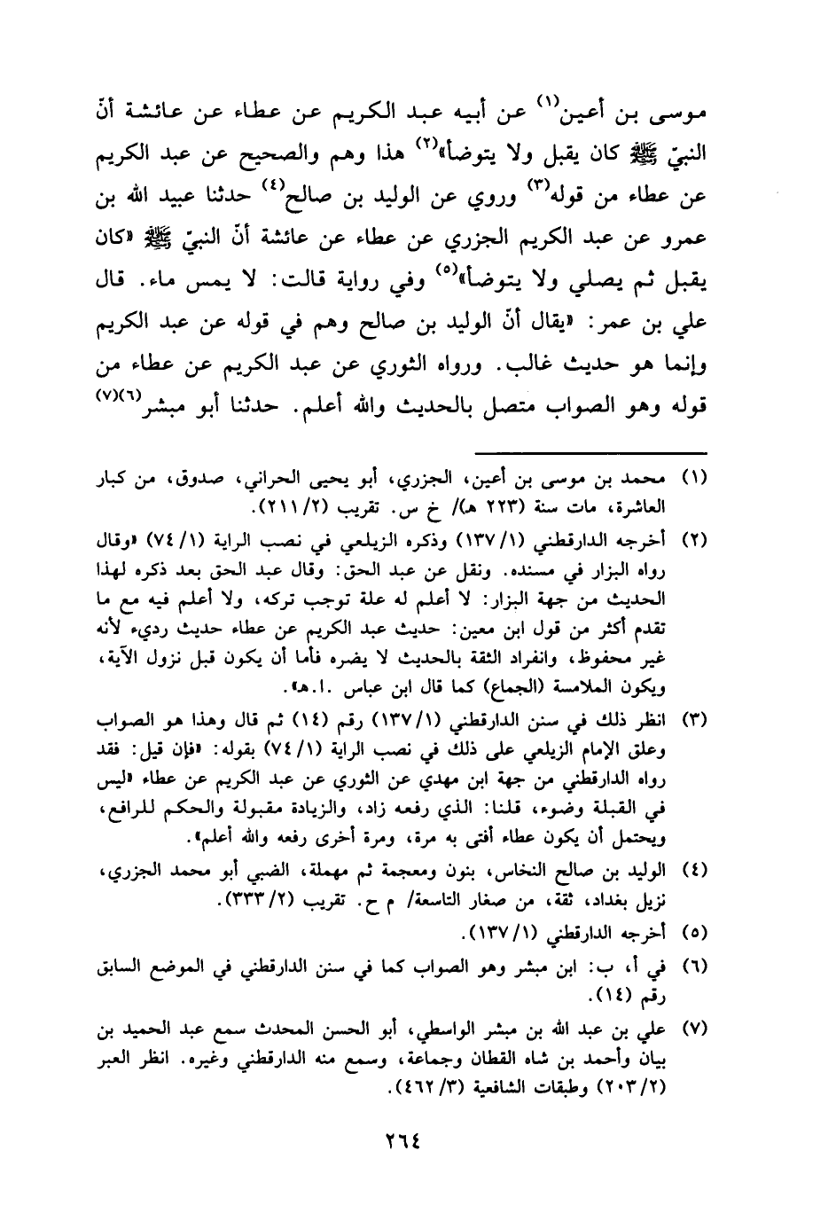 مُوسَى بن أعين عَن أَبِيه عبد الْكَرِيم عَن عَطاء عَن عَائِشَة أَن النَّبِي - صَلَّى اللَّهُ عَلَيْهِ وَسَلَّم َ - كَانَ يقبل وَلَا يتَوَضَّأ " هَذَا وهم وَالصَّحِيح عَن عبد الْكَرِيم عَن عَطاء من قَوْله وَرُوِيَ عَن الْوَلِيد بن صَالح حَدثنَا عبيد الله بن عَمْرو عَن عبد الْكَرِيم الْجَزرِي عَن عَطاء عَن عَائِشَة أَن النَّبِي - صَلَّى اللَّهُ عَلَيْهِ وَسَلَّم َ - " كَانَ يقبل ثمَّ يُصَلِّي وَلَا يتَوَضَّأ " وَفِي رِوَايَة قَالَت: لَا يمس مَاء. قَالَ عَليّ بن عمر: " يُقَال أَن الْوَلِيد بن صَالح وهم فِي قَوْله عَن عبد الْكَرِيم وَإِنَّمَا هُوَ حَدِيث غَالب. وَرَوَاهُ الثَّوْريّ عَن عبد الْكَرِيم عَن عَطاء من قَوْله وَهُوَ الصَّوَاب مُتَّصِل بِالْحَدِيثِ وَالله أعلم. حَدثنَا أَبُو مُبشر