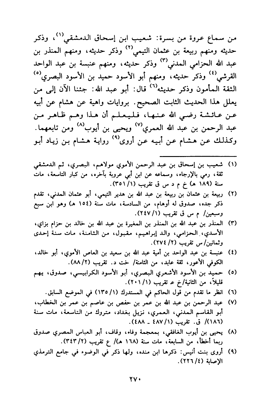 من سَماع عُرْوَة من بسرة: شُعَيْب ابْن إِسْحَاق الدِّمَشْقِي، وَذكر حَدِيثه وَمِنْهُم ربيعَة بن عُثْمَان التَّيْمِيّ وَذكر حَدِيثه، وَمِنْهُم الْمُنْذر بن عبد الله الْحزَامِي الْمدنِي وَذكر حَدِيثه، وَمِنْهُم عَنْبَسَة بن عبد الْوَاحِد الْقرشِي وَذكر حَدِيثه، وَمِنْهُم أَبُو الْأسود حميد بن الْأسود الْبَصْرِيّ الثِّقَة الْمَأْمُون وَذكر حَدِيثه قَالَ: أَبُو عبد الله: جِئْنَا الْآن إِلَى من يُعلل هَذَا الحَدِيث الثَّابِت الصَّحِيح. بروايات واهية عَن هِشَام عَن أَبِيه عَن عَائِشَة رَضِي الله عَنْهَا، فَليعلم أَن هَذَا وهم ظَاهر من عبد الرَّحْمَن بن عبد الله الْعمريّ وَيحيى بن أَيُّوب وَمن تابعهما. وَكَذَلِكَ عَن هِشَام عَن أَبِيه عَن أروى رِوَايَة هِشَام بن زِيَاد أَبُو