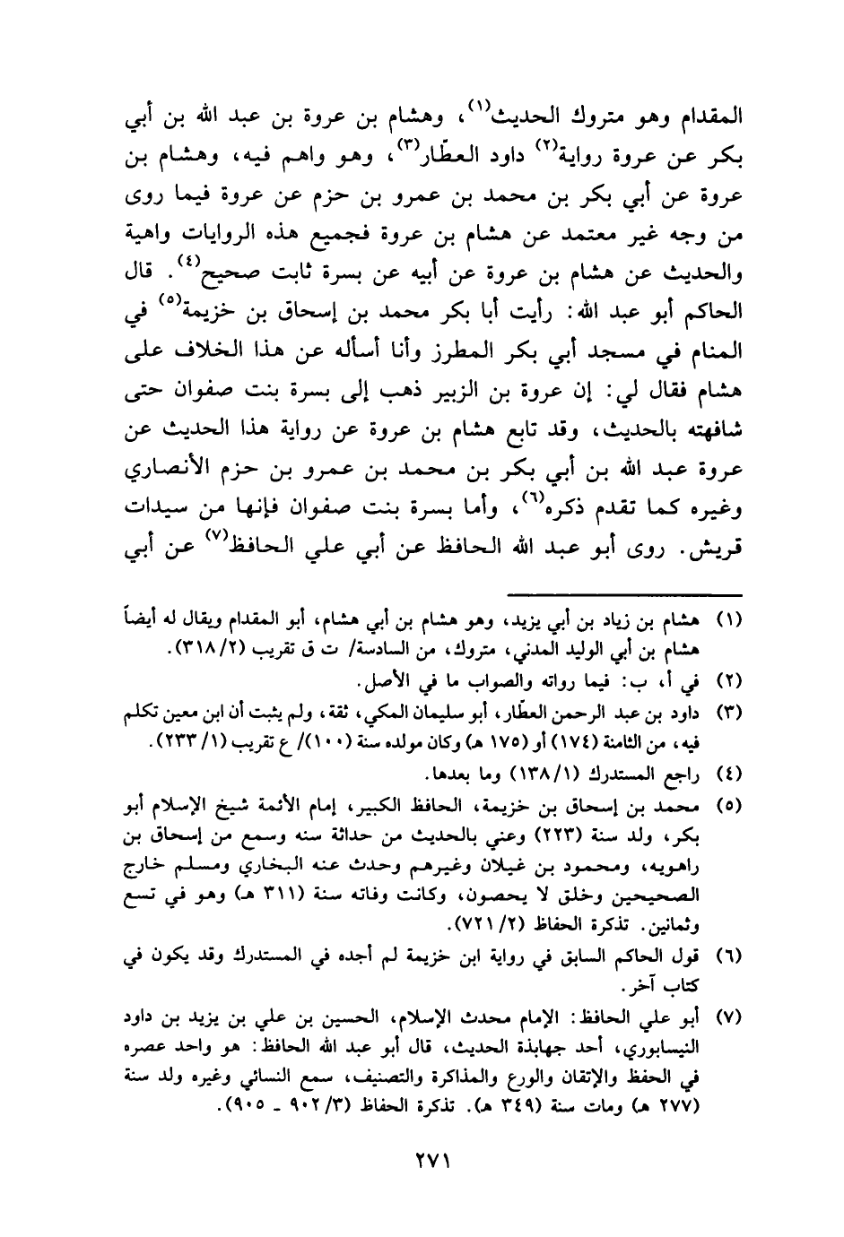 الْمِقْدَام وَهُوَ مَتْرُوك الحَدِيث، وَهِشَام بن عُرْوَة بن عبد الله بن أبي بكر عَن عُرْوَة رِوَايَة دَاوُد الْعَطَّار، وَهُوَ واهم فِيهِ، وَهِشَام بن عُرْوَة عَن أبي بكر بن مُحَمَّد بن عَمْرو بن حزم عَن عُرْوَة فِيمَا روى من وَجه غير مُعْتَمد عَن هِشَام بن عُرْوَة فَجَمِيع هَذِه الرِّوَايَات واهية والْحَدِيث عَن هِشَام بن عُرْوَة عَن أَبِيه عَن بسرة ثَابت صَحِيح. قَالَ الْحَاكِم أَبُو عبد الله: رَأَيْت أَبَا بكر مُحَمَّد بن إِسْحَاق بن خُزَيْمَة فِي الْمَنَام فِي مَسْجِد أبي بكر الْمُطَرز وَأَنا أسأله عَن هَذَا الْخلاف على هِشَام فَقَالَ لي: إِن عُرْوَة بن الزبير ذهب إِلَى بسرة بنت صَفْوَان حَتَّى شافهته بِالْحَدِيثِ، وَقد تَابع هِشَام بن عُرْوَة عَن رِوَايَة هَذَا الحَدِيث عَن عُرْوَة عبد الله بن أبي بكر بن مُحَمَّد بن عَمْرو بن حزم الْأنْصَارِيّ وَغَيره كَمَا تقدم ذكره، وَأما بسرة بنت صَفْوَان فَإِنَّهَا من سيدات قُرَيْش. روى أَبُو عبد الله الْحَافِظ عَن أبي عَليّ الْحَافِظ عَن أبي