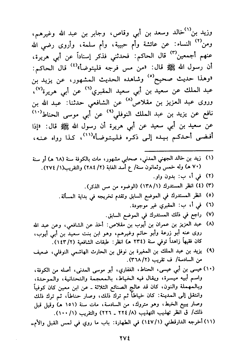 وَزيد بن خَالِد وَسعد بن أبي وَقاص، وَجَابِر بن عبد الله وَغَيرهم، وَمن النِّسَاء: عَن عَائِشَة وَأم حَبِيبَة، وَأم سَلمَة، وأروى رَضِي الله عَنْهُم أَجْمَعِينَ قَالَ الْحَاكِم: فَحَدثني فَذكر إِسْنَادًا عَن أبي هُرَيْرَة، أَن رَسُول الله - صَلَّى اللَّهُ عَلَيْهِ وَسَلَّم َ - قَالَ: " من مس فرجه فَليَتَوَضَّأ " قَالَ الْحَاكِم: " وَهَذَا حَدِيث صَحِيح وَشَاهده الحَدِيث الْمَشْهُور، عَن يزِيد بن عبد الْملك عَن سعيد بن أبي سعيد المَقْبُري عَن أبي هُرَيْرَة، وروى عبد الْعَزِيز بن مِقْلَاص عَن الشَّافِعِي حَدثنَا: عبد الله بن نَافِع عَن يزِيد بن عبد الْملك النَّوْفَلِي عَن أبي مُوسَى الحناط عَن سعيد بن أبي سعيد عَن أبي هُرَيْرَة أَن رَسُول الله - صَلَّى اللَّهُ عَلَيْهِ وَسَلَّم َ - قَالَ: " إِذا أفْضى أحدكُم بِيَدِهِ إِلَى ذكره فَليَتَوَضَّأ "، كَذَا رَوَاهُ عَنهُ،