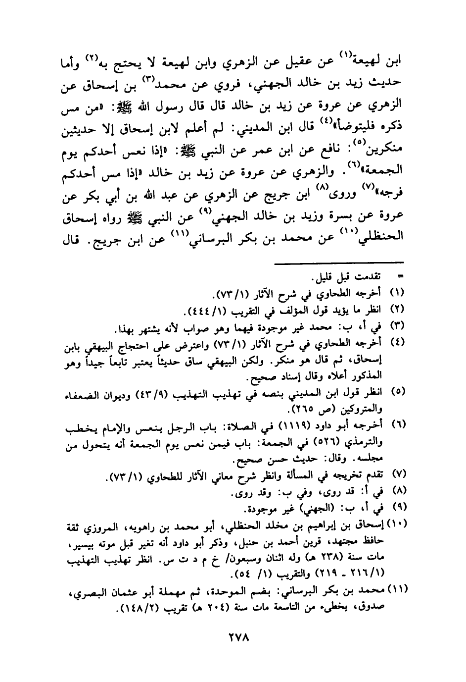 ابْن لَهِيعَة عَن عقيل عَن الزُّهْرِيّ وَابْن لَهِيعَة لَا يحْتَج بِهِ وَأما حَدِيث زيد بن خَالِد الْجُهَنِيّ، فَروِيَ عَن مُحَمَّد بن إِسْحَاق عَن الزُّهْرِيّ عَن عُرْوَة عَن زيد بن خَالِد قَالَ قَالَ رَسُول الله - صَلَّى اللَّهُ عَلَيْهِ وَسَلَّم َ -: " من مس ذكره فَليَتَوَضَّأ " قَالَ ابْن الْمَدِينِيّ: لم أعلم لِابْنِ إِسْحَاق إِلَّا حديثين منكرين: نَافِع عَن ابْن عمر عَن النَّبِي - صَلَّى اللَّهُ عَلَيْهِ وَسَلَّم َ -: " إِذا نعس أحدكُم يَوْم الْجُمُعَة ". وَالزهْرِيّ عَن عُرْوَة عَن زيد بن خَالِد " إِذا مس أحدكُم فرجه " وروى ابْن جريج عَن الزُّهْرِيّ عَن عبد الله بن أبي بكر عَن عُرْوَة عَن بسرة وَزيد بن خَالِد الْجُهَنِيّ عَن النَّبِي - صَلَّى اللَّهُ عَلَيْهِ وَسَلَّم َ - رَوَاهُ إِسْحَاق الْحَنْظَلِي عَن مُحَمَّد بن بكر البرْسَانِي عَن ابْن جريج. قَالَ