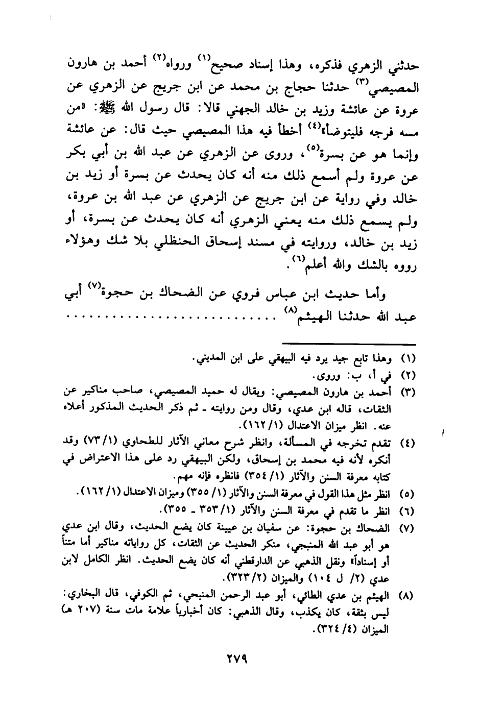 حَدثنِي الزُّهْرِيّ فَذكره، وَهَذَا إِسْنَاد صَحِيح وَرَوَاهُ أَحْمد بن هَارُون المصِّيصِي حَدثنَا حجاج بن مُحَمَّد عَن ابْن جريج عَن الزُّهْرِيّ عَن عُرْوَة عَن عَائِشَة وَزيد بن خَالِد الْجُهَنِيّ قَالَا: قَالَ رَسُول الله - صَلَّى اللَّهُ عَلَيْهِ وَسَلَّم َ -: " من مَسّه فرجه فَليَتَوَضَّأ " أَخطَأ فِيهِ هَذَا المصِّيصِي حَيْثُ قَالَ: عَن عَائِشَة وَإِنَّمَا هُوَ عَن بسرة، وروى عَن الزُّهْرِيّ عَن عبد الله بن أبي بكر عَن عُرْوَة وَلم أسمع ذَلِك مِنْهُ أَنه كَانَ يحدث عَن بسرة أَو زيد بن خَالِد وَفِي رِوَايَة عَن ابْن جريج عَن الزُّهْرِيّ عَن عبد الله بن عُرْوَة، وَلم يسمع ذَلِك مِنْهُ يَعْنِي الزُّهْرِيّ أَنه كَانَ يحدث عَن بسرة، أَو زيد بن خَالِد، وَرِوَايَته فِي مُسْند إِسْحَاق الْحَنْظَلِي بِلَا شكّ وَهَؤُلَاء رَوَوْهُ بِالشَّكِّ وَالله أعلم.