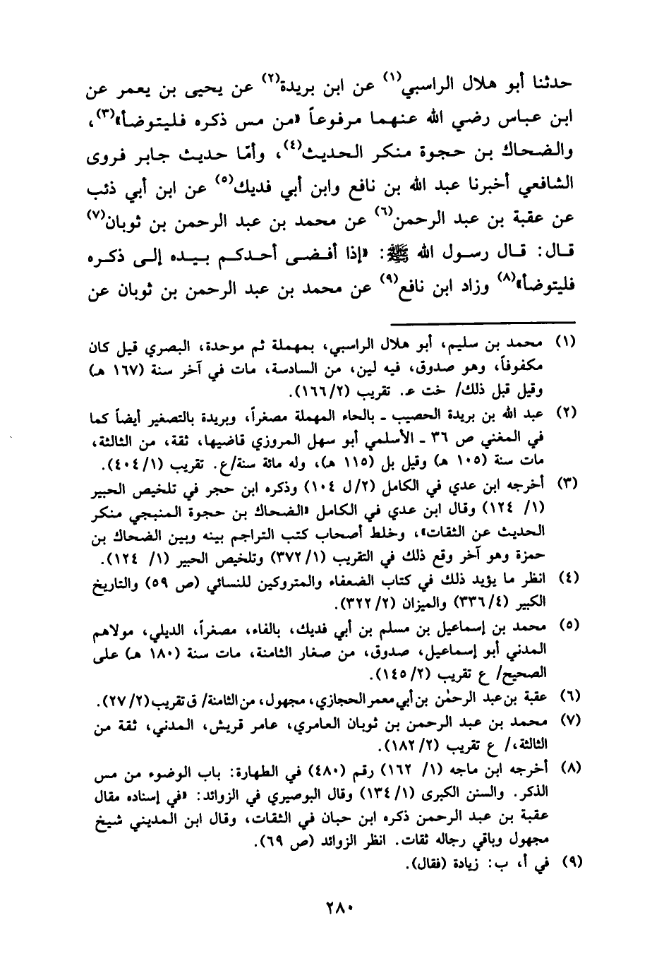 حَدثنَا أَبُو هِلَال الرَّاسِبِي عَن ابْن بُرَيْدَة عَن يحيى بن يعمر عَن ابْن عَبَّاس رَضِي الله عَنْهُمَا مَرْفُوعا " من مس ذكره فَليَتَوَضَّأ "، وَالضَّحَّاك بن حَجْوَةَ مُنكر الحَدِيث، وَأما حَدِيث جَابر فروى الشَّافِعِي أخبرنَا عبد الله بن نَافِع وَابْن أبي فديك عَن ابْن أبي ذِئْب عَن عقبَة بن عبد الرَّحْمَن عَن مُحَمَّد بن عبد الرَّحْمَن بن ثَوْبَان قَالَ: قَالَ رَسُول الله - صَلَّى اللَّهُ عَلَيْهِ وَسَلَّم َ -: " إِذا أفْضى أحدكُم بِيَدِهِ إِلَى ذكره فَليَتَوَضَّأ " وَزَاد ابْن نَافِع عَن مُحَمَّد بن عبد الرَّحْمَن بن ثَوْبَان عَن