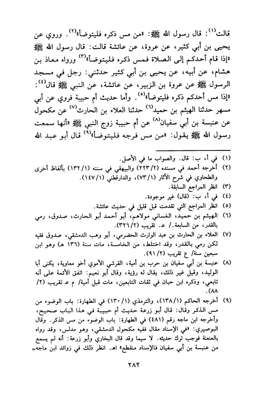 قَالَت: قَالَ رَسُول الله - صَلَّى اللَّهُ عَلَيْهِ وَسَلَّم َ -: " من مس ذكره فَليَتَوَضَّأ ". وَرُوِيَ عَن يحيى بن أبي كثير، عَن عُرْوَة، عَن عَائِشَة قَالَت: قَالَ رَسُول الله - صَلَّى اللَّهُ عَلَيْهِ وَسَلَّم َ - " إِذا قَامَ أحدكُم إِلَى الصَّلَاة فمس ذكره فَليَتَوَضَّأ " وَرَوَاهُ معَاذ بن هِشَام، عَن أَبِيه، عَن يحيى بن أبي كثير حَدثنِي: رجل فِي مَسْجِد الرَّسُول - صَلَّى اللَّهُ عَلَيْهِ وَسَلَّم َ - عَن عُرْوَة بن الزبير، عَن عَائِشَة، عَن النَّبِي - صَلَّى اللَّهُ عَلَيْهِ وَسَلَّم َ - قَالَ: " إِذا مس أحدكُم ذكره فَليَتَوَضَّأ ". وَأما حَدِيث أم حَبِيبَة فَروِيَ عَن أبي مسْهر حَدثنَا الْهَيْثَم بن حميد حَدثنَا الْعَلَاء بن الْحَارِث عَن مَكْحُول عَن عَنْبَسَة بن أبي سُفْيَان عَن أم حَبِيبَة زوج النَّبِي - صَلَّى اللَّهُ عَلَيْهِ وَسَلَّم َ - " أَنَّهَا سَمِعت رَسُول الله - صَلَّى اللَّهُ عَلَيْهِ وَسَلَّم َ - يَقُول: " من مس فرجه فَليَتَوَضَّأ " قَالَ أَبُو عبد الله