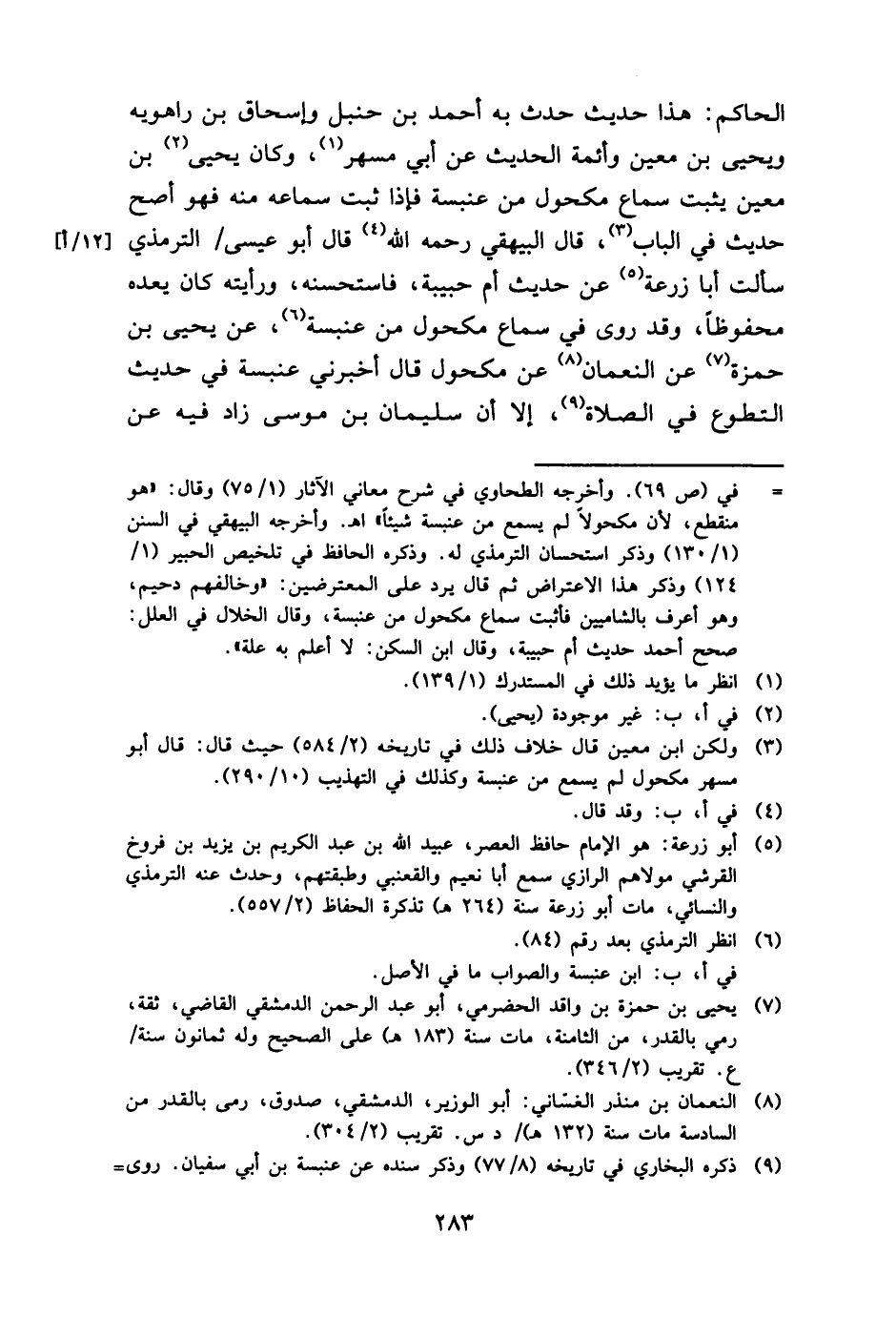 الْحَاكِم: هَذَا حَدِيث حدث بِهِ أَحْمد بن حَنْبَل وَإِسْحَاق بن رَاهَوَيْه وَيحيى بن معِين وأئمة الحَدِيث عَن أبي مسْهر، وَكَانَ يحيى بن معِين يثبت سَماع مَكْحُول من عَنْبَسَة فَإِذا ثَبت سَمَاعه مِنْهُ فَهُوَ أصح حَدِيث فِي الْبَاب، قَالَ الْبَيْهَقِيّ رَحمَه الله قَالَ أَبُو عِيسَى التِّرْمِذِيّ سَأَلت أَبَا زرْعَة عَن حَدِيث أم حَبِيبَة، فَاسْتَحْسَنَهُ، ورأيته كَانَ يعده مَحْفُوظًا، وَقد روى فِي سَماع مَكْحُول من عَنْبَسَة، عَن يحيى بن حَمْزَة عَن النُّعْمَان عَن مَكْحُول قَالَ أَخْبرنِي عَنْبَسَة فِي حَدِيث التَّطَوُّع فِي الصَّلَاة، إِلَّا أَن سُلَيْمَان بن مُوسَى زَاد فِيهِ عَن