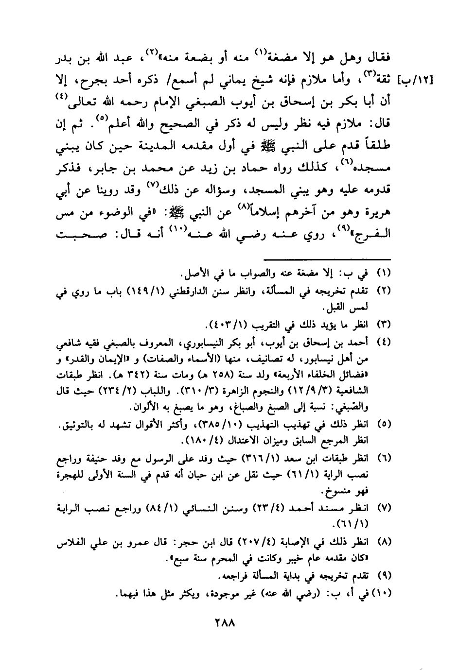 فَقَالَ وَهل هُوَ إِلَّا مُضْغَة مِنْهُ أَو بضعَة مِنْهُ "، عبد الله بن بدر ثِقَة، وَأما ملازم فَإِنَّهُ شيخ يماني لم أسمع ذكره أحد بِجرح، إِلَّا أَن أَبَا بكر بن إِسْحَاق بن أَيُّوب الصبغي الإِمَام رَحمَه الله تَعَالَى قَالَ: ملازم فِيهِ نظر وَلَيْسَ لَهُ ذكر فِي الصَّحِيح وَالله أعلم. ثمَّ إِن طلقا قدم على النَّبِي - صَلَّى اللَّهُ عَلَيْهِ وَسَلَّم َ - فِي أول مقدمه الْمَدِينَة حِين كَانَ يَبْنِي مَسْجده، كَذَلِك رَوَاهُ حَمَّاد بن زيد عَن مُحَمَّد بن جَابر، فَذكر قدومه عَلَيْهِ وَهُوَ يَبْنِي الْمَسْجِد، وسؤاله عَن ذَلِك وَقد روينَا عَن أبي هُرَيْرَة وَهُوَ من آخِرهم إسلاما عَن النَّبِي - صَلَّى اللَّهُ عَلَيْهِ وَسَلَّم َ -: " فِي الْوضُوء من مس الْفرج "، رُوِيَ عَنهُ رَضِي الله عَنهُ أَنه قَالَ: صَحِبت