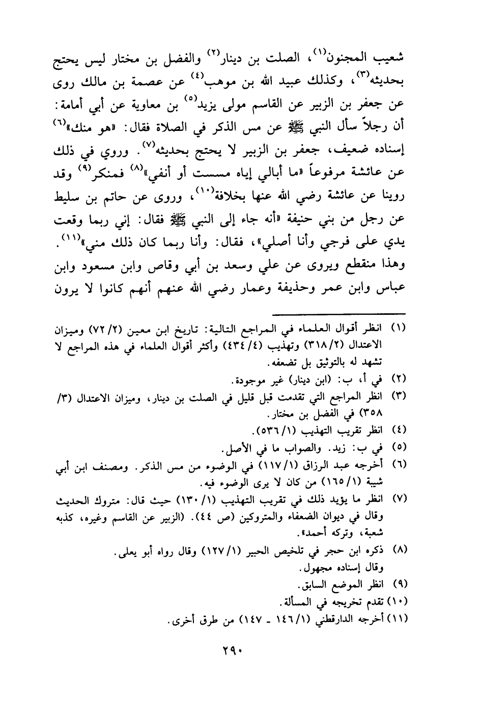 شُعَيْب الْمَجْنُون، الصَّلْت بن دِينَار وَالْفضل بن مُخْتَار لَيْسَ يحْتَج بحَديثه، وَكَذَلِكَ عبيد الله بن موهب عَن عصمَة بن مَالك روى عَن جَعْفَر بن الزبير عَن الْقَاسِم مولى يزِيد بن مُعَاوِيَة عَن أبي أُمَامَة: أَن رجلا سَأَلَ النَّبِي - صَلَّى اللَّهُ عَلَيْهِ وَسَلَّم َ - عَن مس الذّكر فِي الصَّلَاة فَقَالَ: " هُوَ مِنْك " إِسْنَاده ضَعِيف، جَعْفَر بن الزبير لَا يحْتَج بحَديثه. وَرُوِيَ فِي ذَلِك عَن عَائِشَة مَرْفُوعا " مَا أُبَالِي إِيَّاه مسست أَو أنفي " فمنكر وَقد روينَا عَن عَائِشَة رَضِي الله عَنْهَا بخلافة، وروى عَن حَاتِم بن سليط عَن رجل من بني حنيفَة " أَنه جَاءَ إِلَى النَّبِي - صَلَّى اللَّهُ عَلَيْهِ وَسَلَّم َ - فَقَالَ: إِنِّي رُبمَا وَقعت يَدي على فَرجي وَأَنا أُصَلِّي "، فَقَالَ: وَأَنا رُبمَا كَانَ ذَلِك مني ". وَهَذَا مُنْقَطع ويروى عَن عَليّ وَسعد بن أبي وَقاص وَابْن مَسْعُود وَابْن عَبَّاس وَابْن عمر وَحُذَيْفَة وعمار رَضِي الله عَنْهُم أَنهم كَانُوا لَا يرَوْنَ