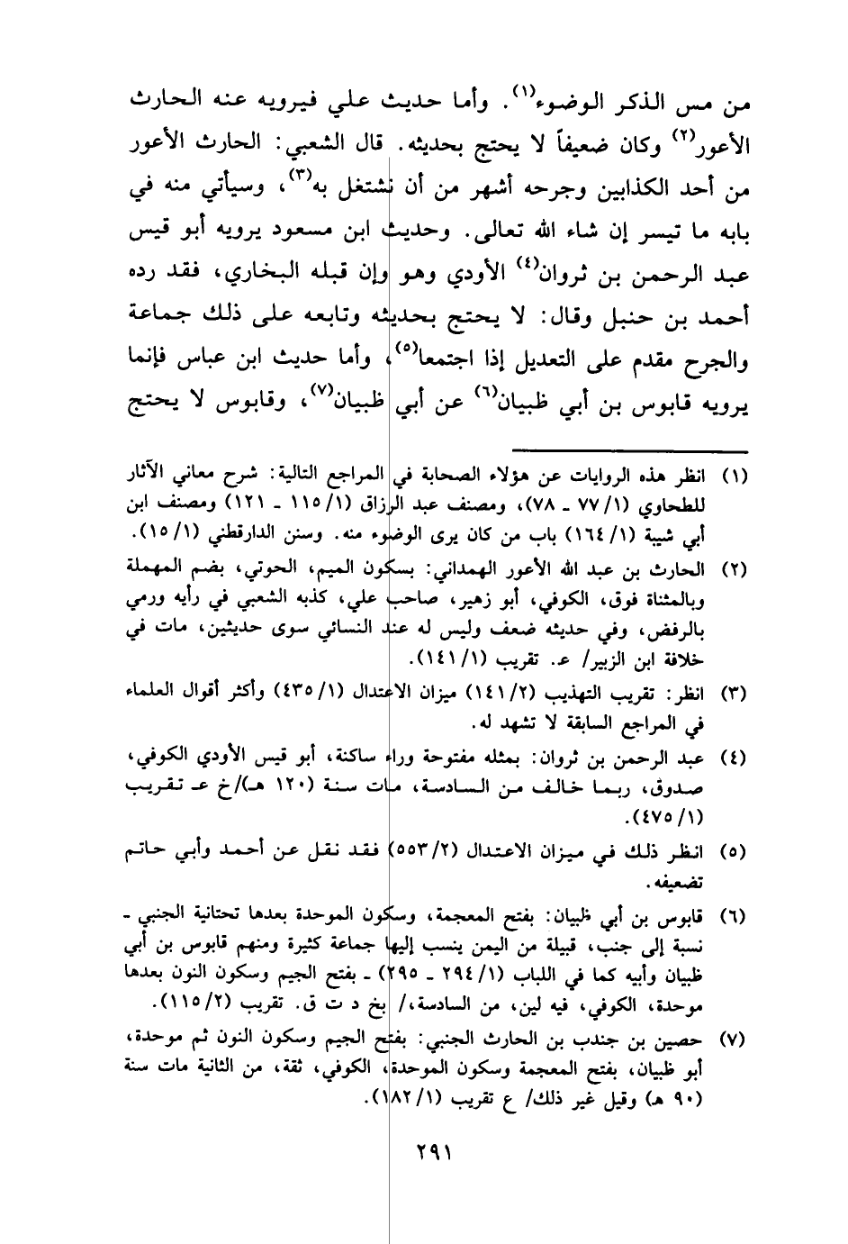من مس الذّكر الْوضُوء. وَأما حَدِيث عَليّ فيرويه عَنهُ الْحَارِث الْأَعْوَر وَكَانَ ضَعِيفا لَا يحْتَج بحَديثه. قَالَ الشّعبِيّ: الْحَارِث الْأَعْوَر من أحد الْكَذَّابين وجرحه أشهر من أَن نشتغل بِهِ، وَسَيَأْتِي مِنْهُ فِي بَابه مَا تيَسّر إِن شَاءَ الله تَعَالَى. وَحَدِيث ابْن مَسْعُود يرويهِ أَبُو قيس عبد الرَّحْمَن بن ثروان الأودي وَهُوَ وَإِن قبله البُخَارِيّ، فقد رده أَحْمد بن حَنْبَل وَقَالَ: لَا يحْتَج بحَديثه وَتَابعه على ذَلِك جمَاعَة وَالْجرْح مقدم على التَّعْدِيل إِذا اجْتمعَا، وَأما حَدِيث ابْن عَبَّاس فَإِنَّمَا يرويهِ قَابُوس بن أبي ظبْيَان عَن أبي ظبْيَان، وقابوس لَا يحْتَج