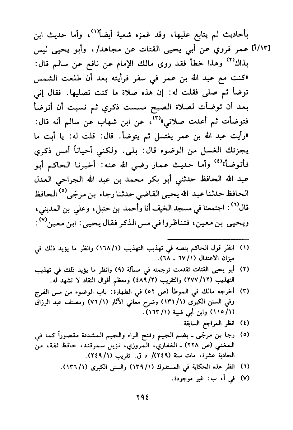 بِأَحَادِيث لم يُتَابع عَلَيْهَا، وَقد غمزه شُعْبَة أَيْضا، وَأما حَدِيث ابْن عمر فَروِيَ عَن أبي يحيى القَتَّات عَن مُجَاهِد، وَأَبُو يحيى لَيْسَ بِذَاكَ وَهَذَا خطأ فقد روى مَالك الإِمَام عَن نَافِع عَن سَالم قَالَ: " كنت مَعَ عبد الله بن عمر فِي سفر فرأيته بعد أَن طلعت الشَّمْس تَوَضَّأ ثمَّ صلى فَقلت لَهُ: إِن هَذِه صَلَاة مَا كنت تصليها. فَقَالَ إِنِّي بعد أَن تَوَضَّأت لصَلَاة الصُّبْح مسست ذكري ثمَّ نسيت أَن أتوضأ فَتَوَضَّأت ثمَّ أعدت صَلَاتي "، عَن ابْن شهَاب عَن سَالم أَنه قَالَ: " رَأَيْت عبد الله بن عمر يغْتَسل ثمَّ يتَوَضَّأ. قَالَ: قلت لَهُ: يَا أَبَت مَا يجزئك الْغسْل من الْوضُوء قَالَ: بلَى. وَلَكِنِّي أَحْيَانًا أمس ذكري فأتوضأ " وَأما حَدِيث عمار رَضِي الله عَنهُ: أخبرنَا الْحَاكِم أَبُو عبد الله الْحَافِظ حَدثنِي أَبُو بكر مُحَمَّد بن عبد الله الجراحي الْعدْل الْحَافِظ حَدثنَا عبد الله يحيى القَاضِي حَدثنَا رَجَاء بن مرجى الْحَافِظ قَالَ: اجْتَمَعنَا فِي مَسْجِد الْخيف أَنا وَأحمد بن حَنْبَل، وَعلي بن الْمَدِينِيّ، وَيحيى بن معِين، فَتَنَاظَرُوا فِي مس الذّكر فَقَالَ يحيى: ابْن معِين:
